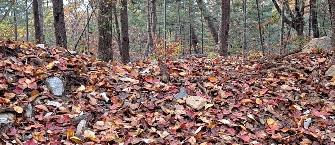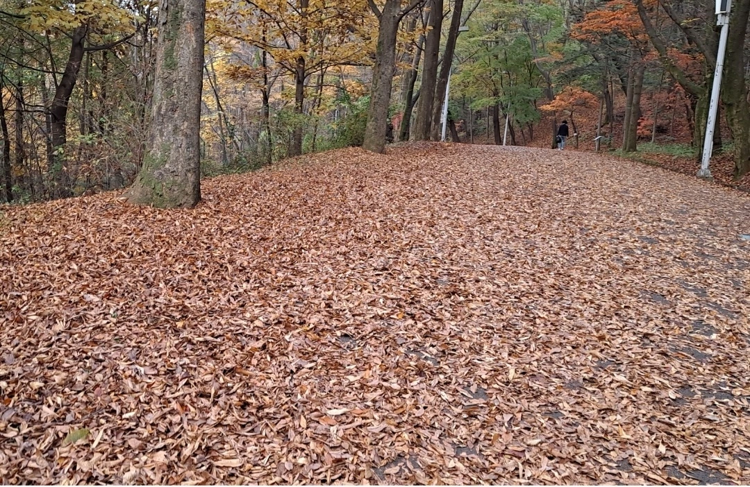 또 다른 ‘낙엽 동산’을 만났다. 나무 아래 둔덕을 이룬 듯 두텁게 쌓인 낙엽들의 침묵을 마주한 순간, 숨을 한번 깊이 몰아쉬었다. 나도 모르게 가슴이 벅차오른 까닭이다. 빈틈없이 포개어진 수많은 잎사귀들은 마지막 돌아갈 곳이 바로 여기라는 듯 고요하고 평화롭다. 어떤 숭고미 같은 것이 켜켜이 쌓여있는 듯하다. 한편으로, 쓸쓸한 연민과 애잔한 감상이 가슴에 번지는 건 어쩔 수가 없다.