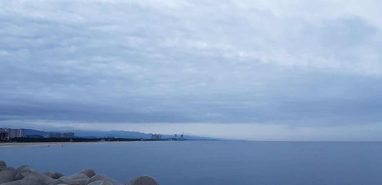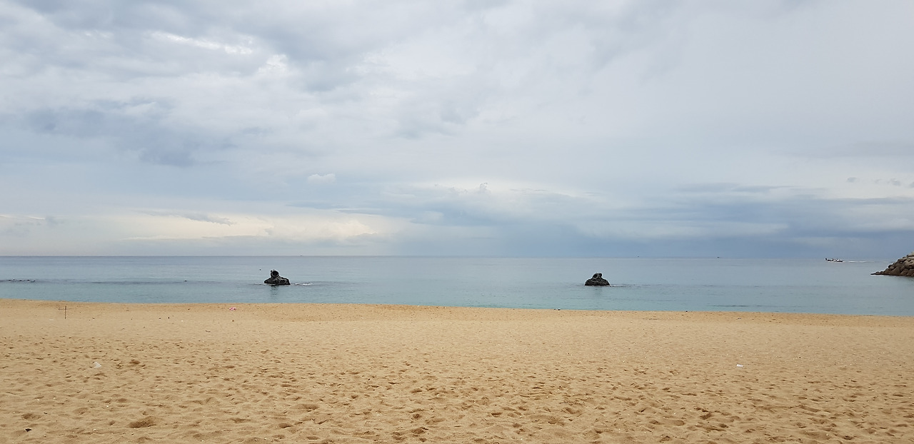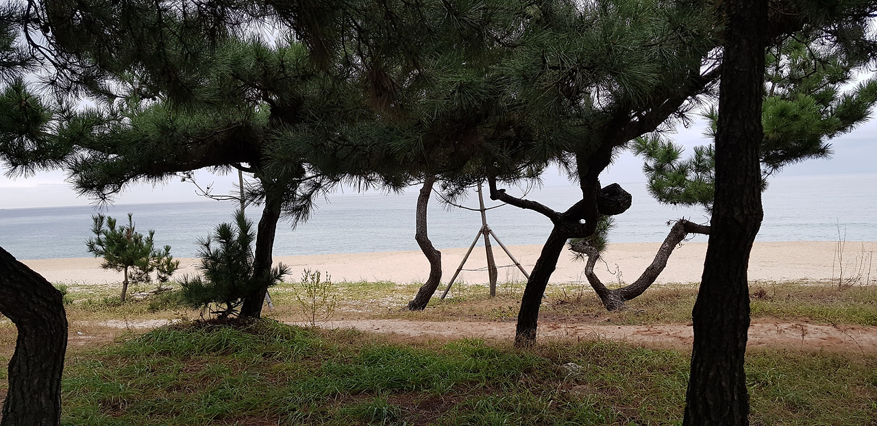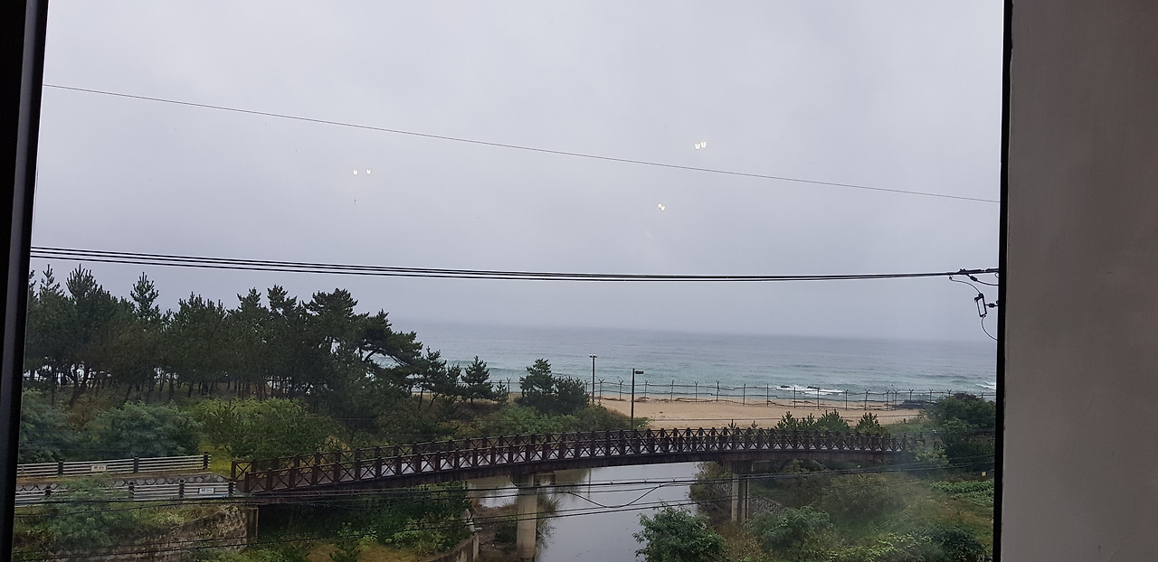 모닝 커피 한잔 하며, 해변을 따라 쭉 걸어서 소나무숲 입구까지 갔는데 갑자기 비가 쏟아져서 급하게 숙소로 되돌아왔다.