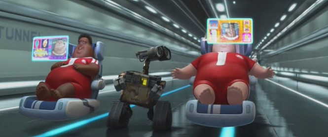 이렇게 EVE를 떠나보낼 수 없기 때문이다. EVE의 우주선 이름은 엑시엄호. 그런데 이 우주선에 있는 인간들의 모습은 월E가 알고 있는 인간들의 모습과는 어딘가 좀 다르다. 로봇이 모든 것을 해결해주기 때문에 본인들의 힘으로는 아무 것도 할 수 없는 상태. 그들의 일과는 앉아서 먹기만 하는 것이다.