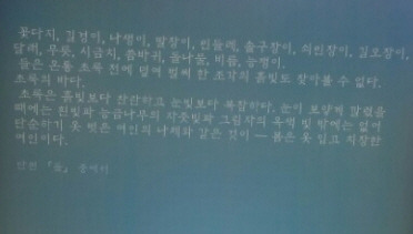 밤중을 지난 무렵인지 죽은 듯이 고요한 속에서 짐승 같은 달의 숨소리가 손에 잡힐 듯이 들리며, 콩 포기와 옥수수 잎새가 한층 달에 푸르게 젖었다. 산허리는 온통 메밀밭이어서 피기 시작한 꽃이 소금을 뿌린 듯이 흐붓한 달빛에 숨이 막힐 지경이다.