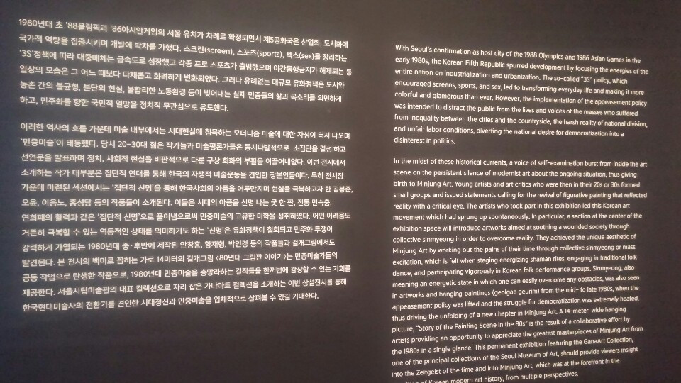 1980년대 초 ’88올림픽과 ’86아시안게임의 서울 유치가 차례로 확정되면서 제5공화국은 산업화, 도시화에 국가적 역량을 집중시키며 개발에 박차를 가했다. 스크린(screen), 스포츠(sports), 섹스(sex)를 장려하는 3S정책에 따라 대중매체는 급속도로 성장했고 각종 프로 스포츠가 출범했으며 야간통행금지가 해제되는 등 일상의 모습은 그 어느 때보다 다채롭고 화려하게 변화되었다. 그러나 유례없는 대규모 유화정책은 도시와 농촌 간의 불균형, 분단의 현실, 불합리한 노동환경 등이 빚어내는 실제 민중들의 삶과 목소리를 외면하게 하고, 민주화를 향한 국민적 열망을 정치적 무관심으로 유도했다. 이러한 역사의 흐름 가운데 미술 내부에서는 시대현실에 침묵하는 모더니즘 미술에 대한 자성이 터져 나오며 ‘민중미술’이 태동했다.