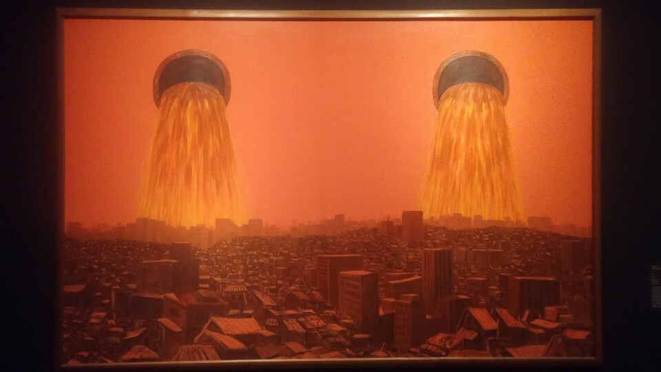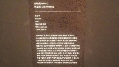 붉은 색의 거대한 용암이 쏟아져내리는 임옥상의 <하수구>는 도시개발계획이라는 명목 하에 삶의 터전을 잃고 내몰린 도시 난민의 처지를 보여주는 작품이다.