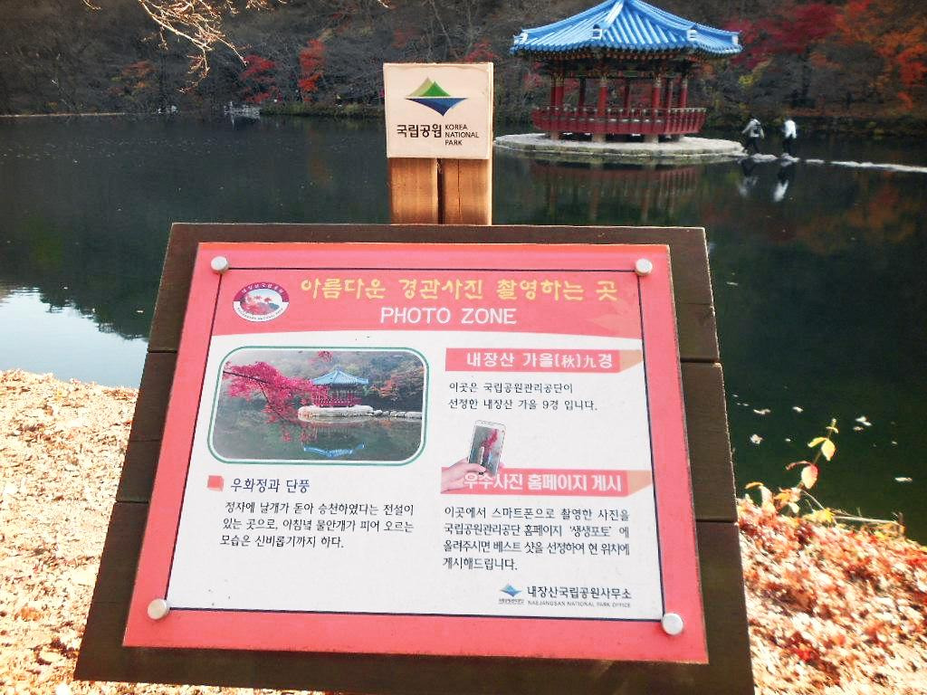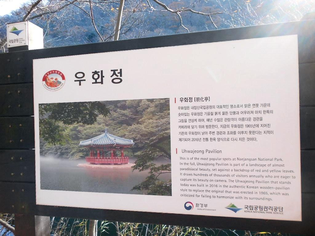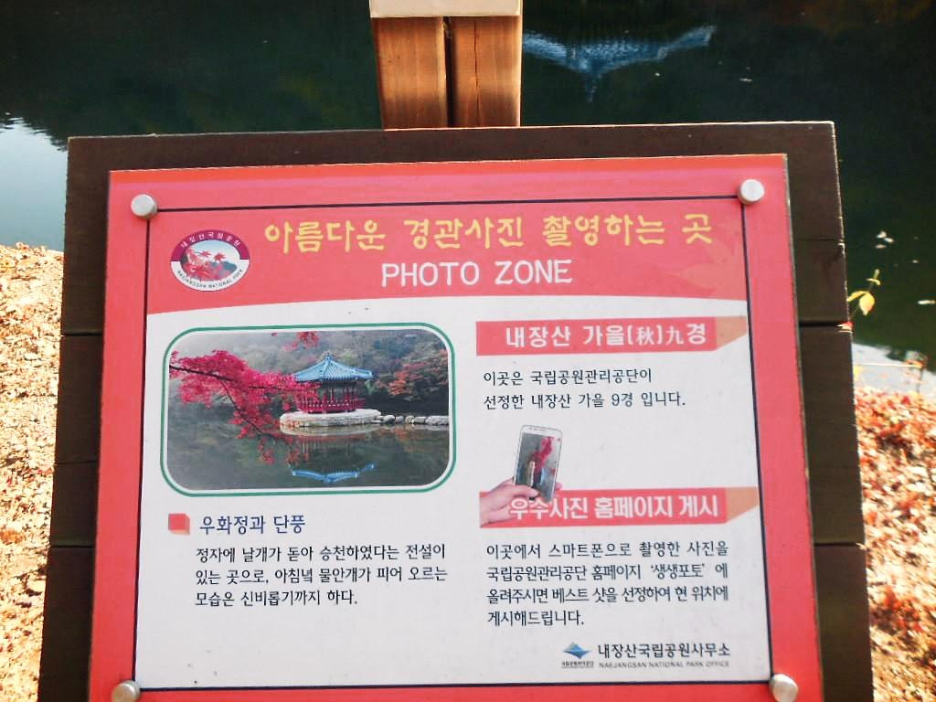 그런데, 매표소부터 내장산 입구로 가는 길에 줄줄이 있는 식당이 저마다 자랑하듯 바깥에 전시한 내장산의 사진 중 호숫가 한가운데 서있는 파란지붕의 하얀색 콘크리트 기둥 건물 이름도 우화정이라는데, 내가 본 우화정은 전통양식 건물의 목조건물이다. 처음에는 그럼 우화정이 2개인가? 라는 단순한 생각을 했다. 내장산의 이곳 말고 다른 곳에도 우화정이 있나?