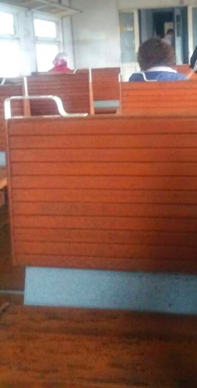 통근 열차는 마주보게끔 좌석이 배열 되어 있다.