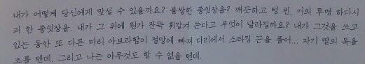 세상의 광기 앞에 나는 나 자신의 광기를 세우려 합니다. 그렇게 되면 우리, 나와 세계는 같은 언어로 말을 하게 되겠지요. 이 순간 나는 잠에서 깨어난 화산 옆 텅 빈 시골에 혼자 남은 사람과도 같습니다. 뜨거운 용암이 흘러 드는데 나는 글자 하나가 적힌 종잇장을 앞에 쥐고 서 있습니다. 당신에게 부탁할 수 있다면, 저는 이 글자, 이 글자 하나만은 제가 영원히 사용할 수 있게 해달라고 부탁하겠습니다.