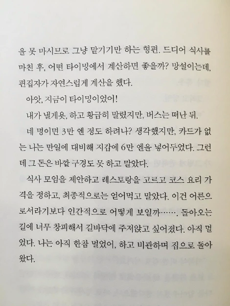 오늘은 내가 계산하리라 굳게 다짐하며 최적의 타이밍까지 생각해놓았지만 기껏 공들인 계획을 미처 펼쳐볼 겨를없이 편집자에게 식사 계산을 뺏긴 이야기.