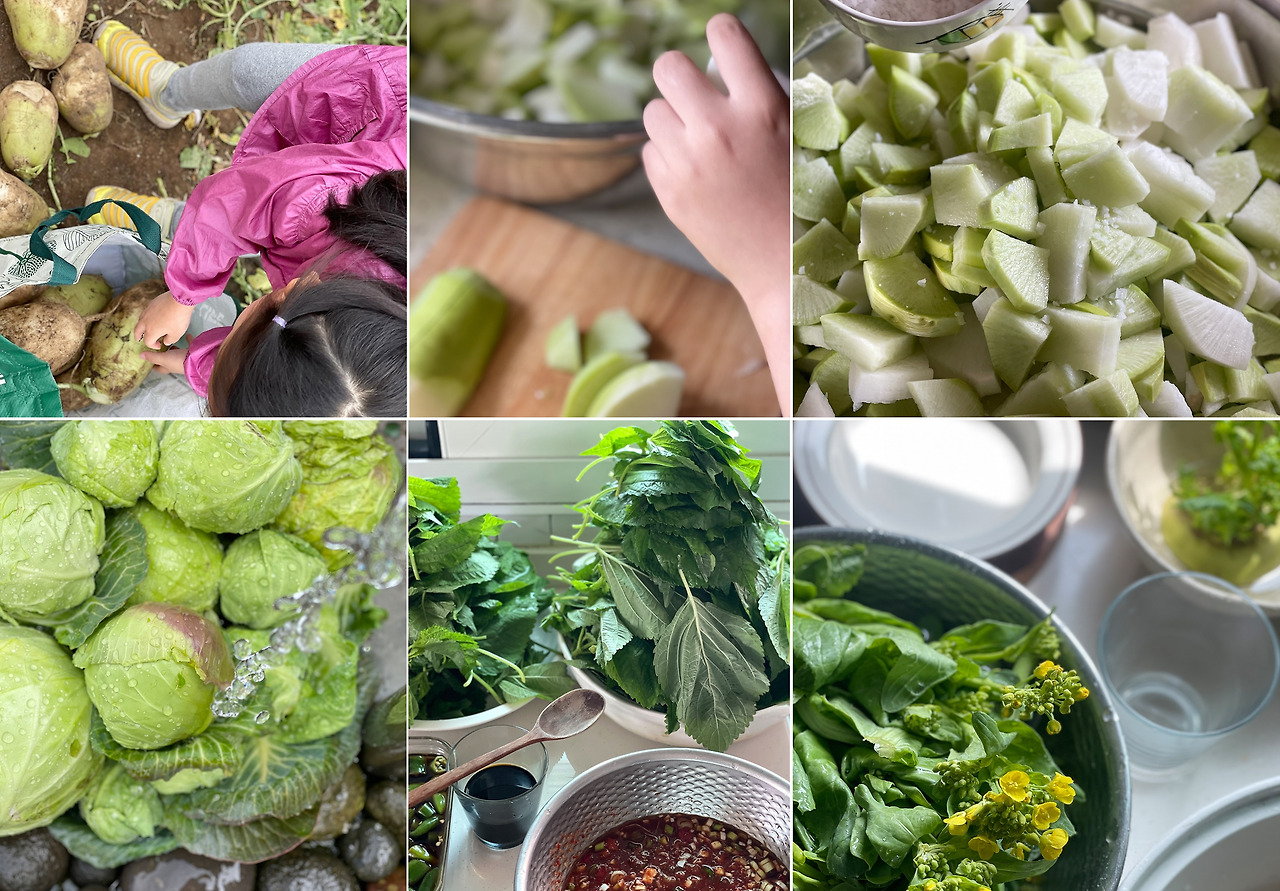 계절마다 할아버지는 우리 집 마당에 풋고추, 깻잎, 양파를 두고 가셨다. 할아버지 따님이 농사짓는 콜라비나 양배추처럼 속이 꽉 차서 무거운 작물은 수확이 끝나면 나와 아이들을 불러 이삭 줍기를 하게 했다. 아이들은 크기가 작거나 상처가 난 채소를 보물찾기 하듯 찾아냈다. 낑낑대며 집으로 들고 와서 물에 씻고 다듬으면서 크고 반듯하지 않아도 다 먹을 수 있다는 걸. 밥상 위 콜라비 장아찌와 양배추찜이 마트에 가서 돈을 주고 사는 물건이 아니라 흙에서 자라는 생명이라는 걸 몸으로 배웠다. 식사 전 '잘 먹겠습니다'를 아이들이 먼저 말하게 되었다.