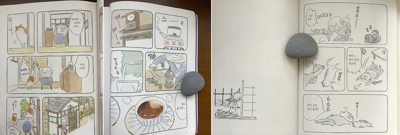 오늘 쉬는 시간과 점심시간에 아이들이 읽고 난 책이 가득한 북트럭에도『고양이와 할아버지』,『마루와 강쥐』,『마법천자문』,『오므라이스 잼잼』,『흔한 남매』가 자리를 차지하고 있었다. 정리를 하려다가 귀여운 그림이 맘에 들어 『고양이와 할아버지』한 권을 집어 들었다. 잠깐 보고 서가에 꽂아둬야지 했는데 북트럭 앞에 서서 후루룩 읽어버렸다.