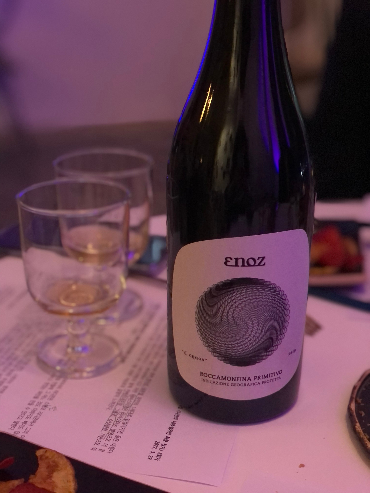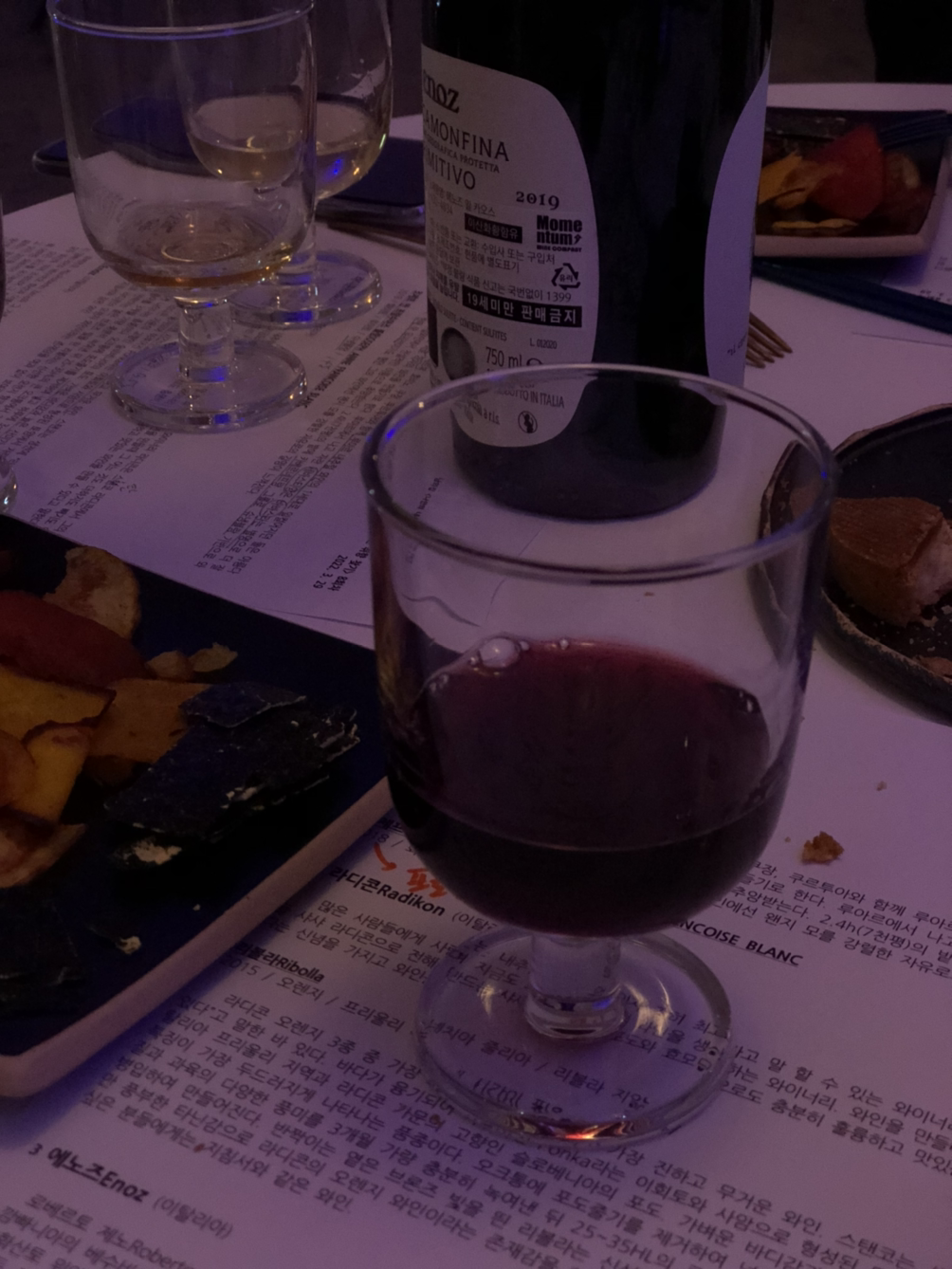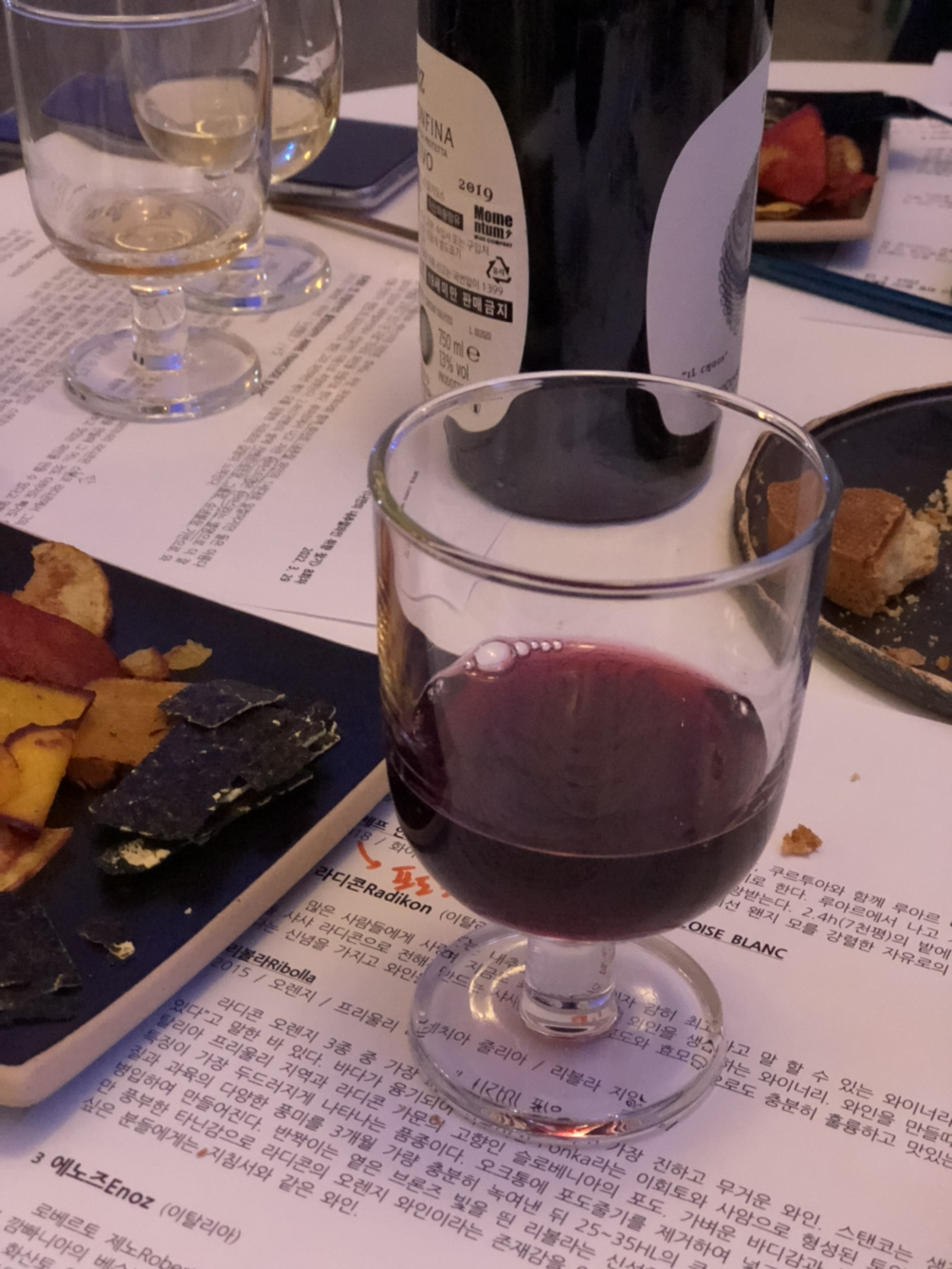 세번째로 테이스팅했던 이 와인은 이탈리아의 에노즈 와인인데, 처음 느낌은 이 와인이 셋 중 단연코 1등이었다. 내추럴와인인데도 불구하고 클래식한 레드와인의 맛을 간직하고 있었는데, 내추럴와인인 걸 알고 마셔서 그럴 수 있지만 일반 와인보다 훨씬 더 깔끔한 맛이었다. 만약 이 와인이 내추럴와인이 아니었다고 해도 가격대가 꽤 있을 것 같은 느낌이었다. 한편 내가 너무 일반 와인 맛에 길들여져 있어서 에노즈의 맛도 그렇게 느끼는 건 아닌가 하는 생각도 해 보았다. 그럼에도 불구하고 정말 이 와인도 굉장히 만족스러운 와인이었다.