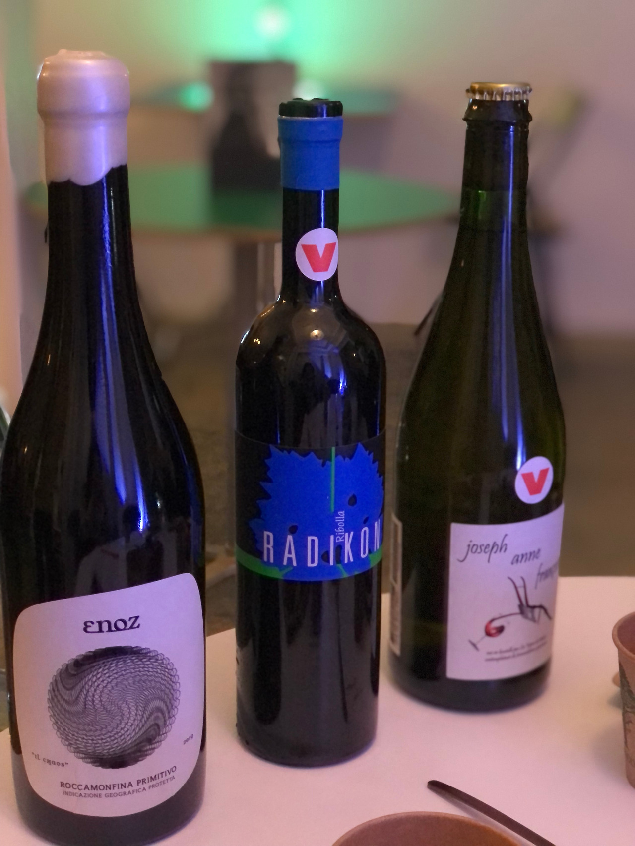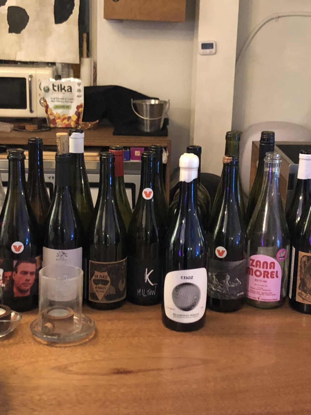 이 날 우리가 테이스팅했던 와인들은 바로 위 세 병의 와인들이었다. 순서대로 세워져 있었고, 두번째 라디콘은 테이스팅 전에 미리 열어두는 것이 권장되어 있는 내추럴와인이라 미리 오픈해 두셨다고 한다. (실제로 모임 초반과 중, 후반부에 테이스팅했던 느낌이 완전히 달랐다.)
