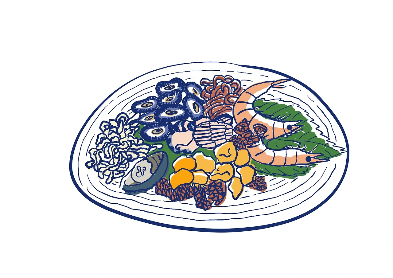 음식들이 가운데해삼 멍게등이 있는 접시는