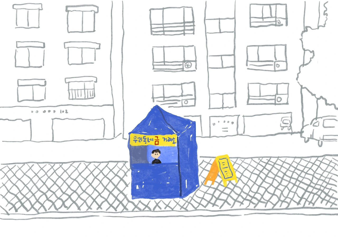 별안간 길 한복판에 금 거래소가 생겼다.금을 주면 과연 뭘 내어줄까? 싶은아주 작은 천막이다. 바람이라도 휙불면 맡긴 금과 함께 날아가버릴 것같다. 물론 맡길 금이 없어서 괜한걱정이지만. 금니 하나가 있긴 한데.