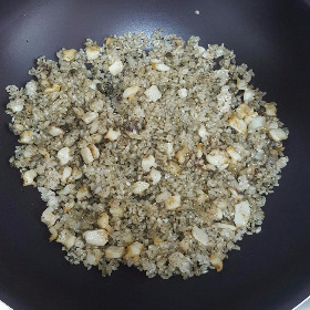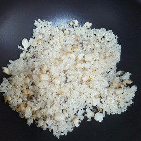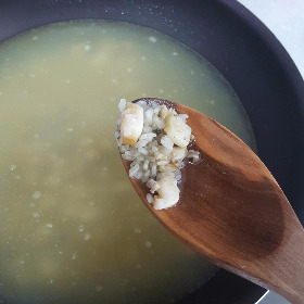 잘 달궈진 팬에 참기름을 적당히 두르고 미리 준비한 쌀을 볶아 주세요. 볶다 보면 누룽지처럼 꼬들꼬들한 느낌이 드는데 이때 준비한 전복을 넣고 같이 볶아 줍니다.