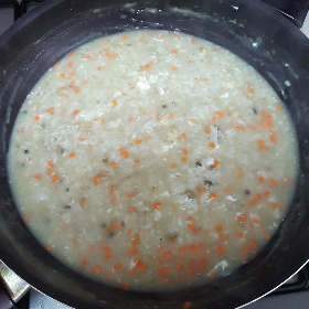 쌀이 잘 퍼지면 꽃소금으로 밑간을 하고 당근과 달걀흰자를 넣고 한 소금 더 끓여줍니다.