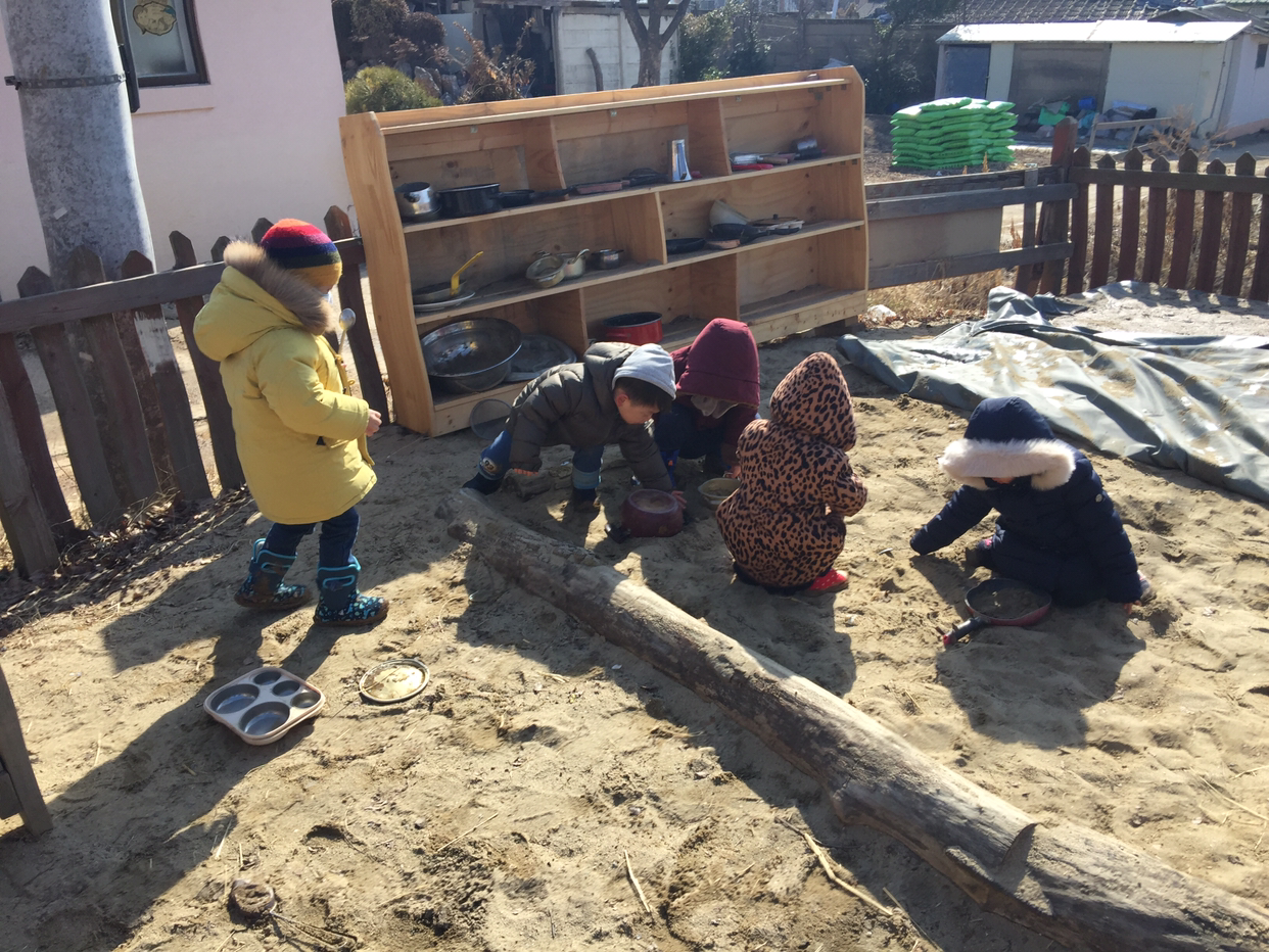 30분쯤, 짧지만 인상적인 나들이를 마치고 어린이집 마당에 돌아와서는 안으로 들어가는 게 아니라 모래판에 자리를 잡고 소꿉놀이를 시작했다.