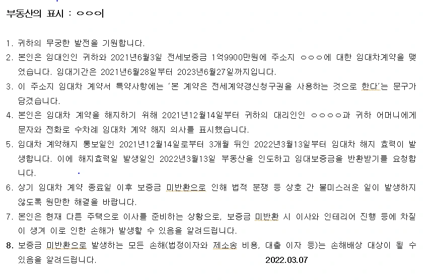 1. 임대차 해지 의사는 문자와 전화로 임대인 대리인에게 알렸다. 그래도 확실하게 '증거'로 남기는 게 좋다고 해서 내용증명을 보낼 준비를 했다. 내용증명은 인터넷에 돌아다니는 양식을 기본으로 작성했고, 변호사 친구의 감수를 받았다. 혹시라도 임대인이 내용증명을 받지 않을까 걱정했으나 다행히 잘 수령했다.
