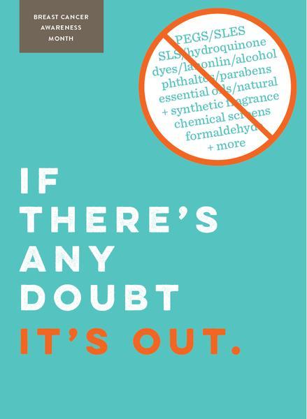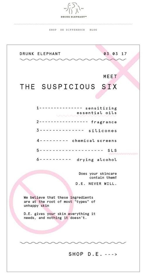 위에서 이야기한 티파니 매스터슨이 배제하기로 했던 6가지 성분을 드렁크 엘리펀트에서는 '의심스러운 6가지(Suspicious 6)'으로 명명했는데, 미국 히어로물의 악당 6명을 지칭하는 느낌의 워딩이라서 재미있죠. 그리고 조금이라도 유해할 가능성이 있는 성분은 모두 배제한다는 원칙도, '의심이 든다면 배제한다(If there's any DOUBT, it's OUT)'라는 언어유희가 들어가 있는 재치 있는 문장으로 표현했고요.