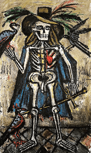 그러던 중 '베르나르 뷔페'라는, 사람들에게 잘 알려지지 않은 사람의 전시회가 열렸다. 정말 가벼운 마음으로 전시회를 갔고 그 곳에서 스탕달 신드롬과 가장 근접한 경험을 가지게 되었다. 이전에도 <까마귀가 나는 밀밭> 그림을 보고 참으로 큰 충격을 느꼈던 적이 있는데, 그보다 더 큰 충격을 받은 것이다. <죽음> 시리즈 연작을 보게 되었는데 그 중에 <La mort 10> '죽음 10' 이라는 작품이 있었다. 해골 그림에 까마귀가 어깨와 바닥에 앉아있고, 또 검을 들고 있는데 심장이 드러나있는 그런 그림이다.