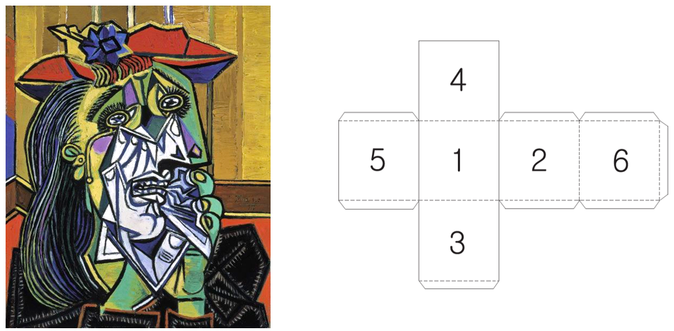 피카소의 그림에는 '큐비즘'이라는 개념이 나오게 된다. 나는 아직 이것을 아주 간단하게 설명할 능력이 없으므로 약간은 길게 설명해보겠다. 피카소의 그림을 보면 '왜 이렇게 조각나있지?' 라는 생각을 한 번쯤 해볼 수 있었을 것이다. 자, 이제는 주사위의 전개도를 한 번보자. 우리는 전개를 보며 자연스레 육면체라는 것을 상상할 수 있다. 그리고 그것과 크게 다를 바 없다는 것도 안다.
