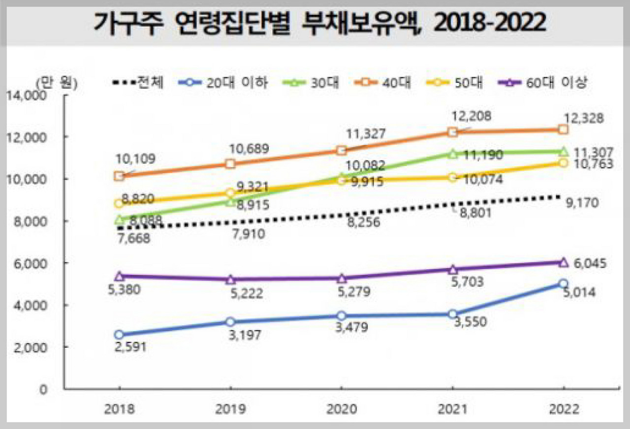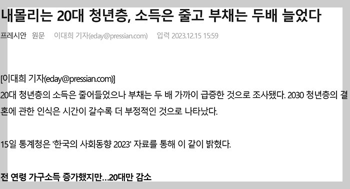 데이터는 더 무섭다. 2014년부터 2023년까지 9년간, 전체 가구 부채가 51.8% 늘 때 20대 부채는 217.9%, 30대는 115.3%가 늘었다. 이건 증가가 아니라 폭발이다. 심지어 질도 나쁘다. 담보 없는 고금리 신용대출, 카드론이다. 29세 이하 청년 가구는 자산의 42.4%가 빚이다. 자산 가격 조금만 흔들리면 바로 '깡통'이다.