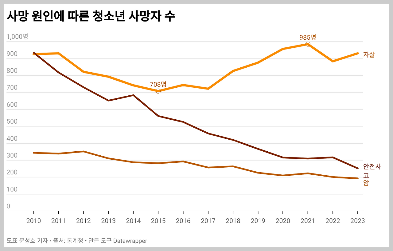 46.1%. 10대의 사망 원인 중 자살이 차지하는 비율이다. 2008년까지만 해도 대한민국의 청소년 자살률은 OECD 국가 중 15위였다. 청소년 자살을 막기 위한 여러 노력에도 불구하고 10년 넘는 시간 동안 자살률은 꾸준히 증가했고, 그 증가세는 이제 무시할 수 없는 수준이 됐다.