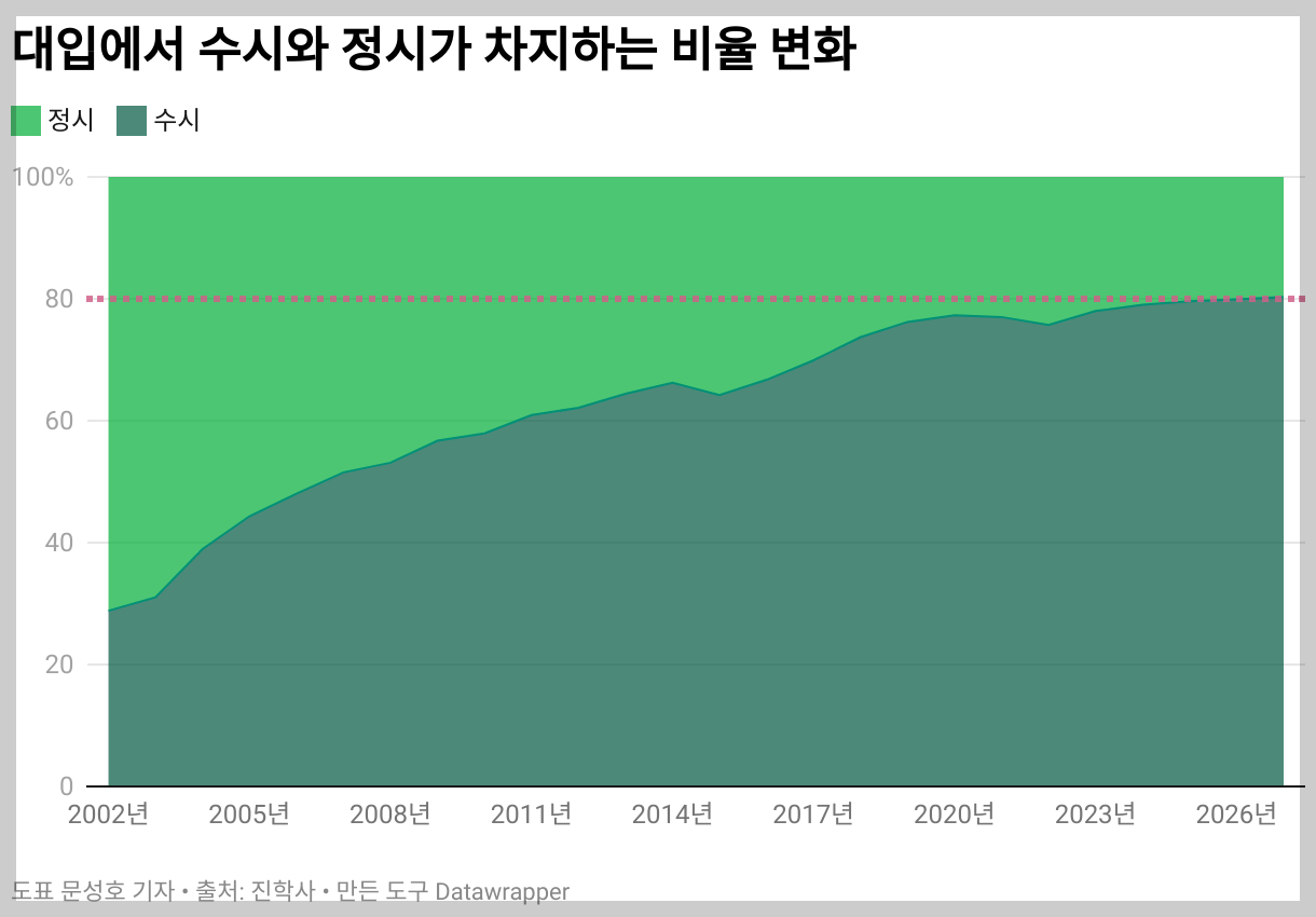 내신 제도는 지난 수십 년간 몇 번의 변화를 거쳤다. 이러한 과정에서 ‘수시’로 대학을 가는 사람들은 ‘정시’로 대학을 가는 사람들보다 3배 이상 많아져 80%에 육박하게 됐다. 한국대학교육협의회 발표에 따르면 2026학년도 대입에서 수시가 차지하는 비율은 79.9%고, 앞으로는 더 증가할 전망이다.(도표)