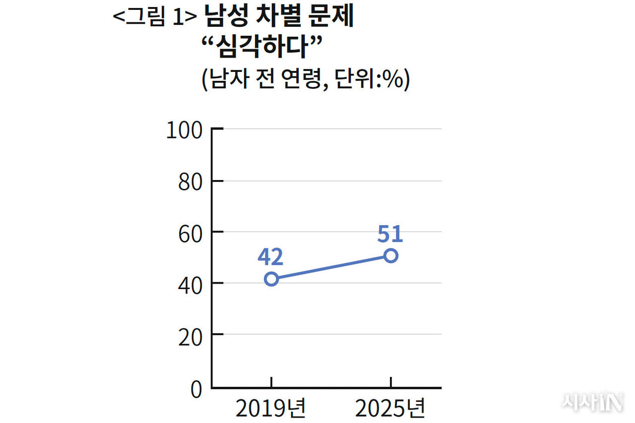 한국 사회에서 남성이 차별받는다는 인식이 7년 전보다 늘었다. 남성 차별 문제가 “심각하다”는 응답자는 2019년 42%였다. 2025년에는 51%다. ‘20대 남자’ 얘기가 아니다. 기성세대까지 포함한 전체 남자 응답자다(〈그림 1〉 참조). 이제 ‘남성 마이너리티 자의식’을 청년을 넘어 남성 전체가 공유하는가?