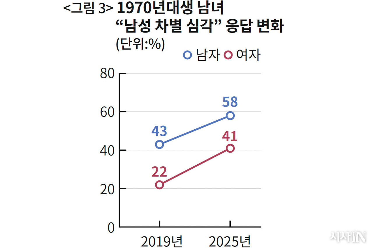 1970년대생 남자들이 2019년에 남성 차별을 심각하게 생각한 비율은 43%였다. 2025년에는 58%다. 그림에는 생략했지만 1960년대생 남자도 같은 방향으로 변했다.