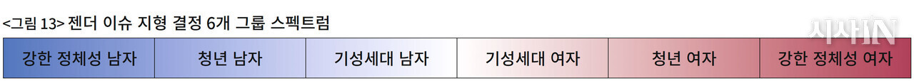 지금부터 이 관찰을 일반화해서 하나의 모델을 만들어보자. 시작은 〈그림 13〉이다. 젠더 이슈의 지형을 결정하는 그룹은 6개가 있다. 〈그림 13〉은 이 6개 그룹을 스펙트럼으로 보여준 것이다.