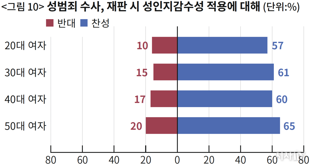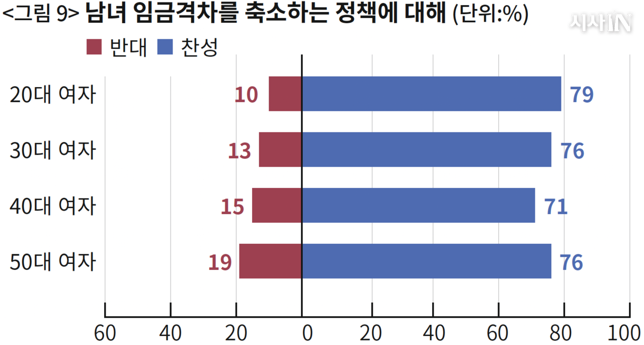 〈그림 9〉는 남녀 임금격차 축소를 지원하는 정책에 대한 찬반 의견이다. 여기서 여성들의 세대 차이는 사라진다. 모든 세대 여성이 압도적으로 지지한다. 〈그림 10〉은 성범죄 수사와 재판에서 ‘성인지감수성’을 적용하는 일에 대한 찬반 의견이다. 마찬가지로 모든 세대 여성이 확고하게 지지한다.