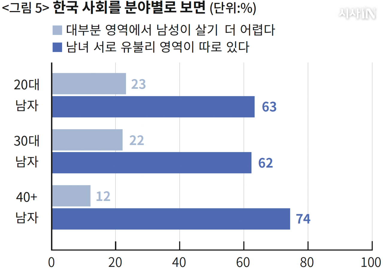 2025년 조사에서 우리는 이렇게 물었다. 한국 사회를 분야별로 살펴보았을 때, 다음 중 어느 의견에 공감하는가? 첫째, 대부분 영역에서 여성이 살기 더 어렵다. 둘째, 대부분 영역에서 남성이 살기 더 어렵다. 셋째, 남녀 서로 유리한 영역과 불리한 영역이 따로 있다. 결과는 〈그림 5〉에 나와 있다. “대부분 영역에서 남성이 살기 더 어렵다”라는 답은 20대 남자에서 23%, 30대 남자에서 22%다. 40세 이상 기성세대 남자에서는 12%다. 이 결과를 〈그림 2〉와 비교해 보자. 놓치고 있던 차이가 드러난다.