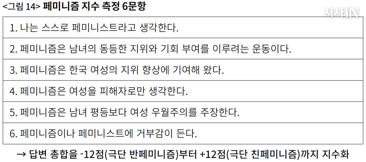 페미니즘 지수는 〈그림 14〉에 나오는 페미니즘 인식 6개 질문으로 측정한다. 각 질문마다 -2점(강한 페미니즘 부정)부터 +2점(강한 페미니즘 긍정)까지 점수를 매기면, 6개 응답을 합산해 -12점부터 +12점까지 분포를 얻을 수 있다. 이런 방식으로 하면 보통은 0점(중립)이 가장 두껍고, 양극단 값은 거의 없는 종 모양 분포곡선이 나온다. 그런데 페미니즘 태도에서는 청년 남성들이 -12점 근처로 대거 결집하여 극단값이 가장 두꺼운 특이한 그림이 나온다. 이 발견은 이후 7년 동안 페미니즘 지수를 측정한 모든 조사에서 검증됐다(〈그림 15〉). 2025년 조사에서 20대 남자 -12점 그룹의 규모는 23.6%다.