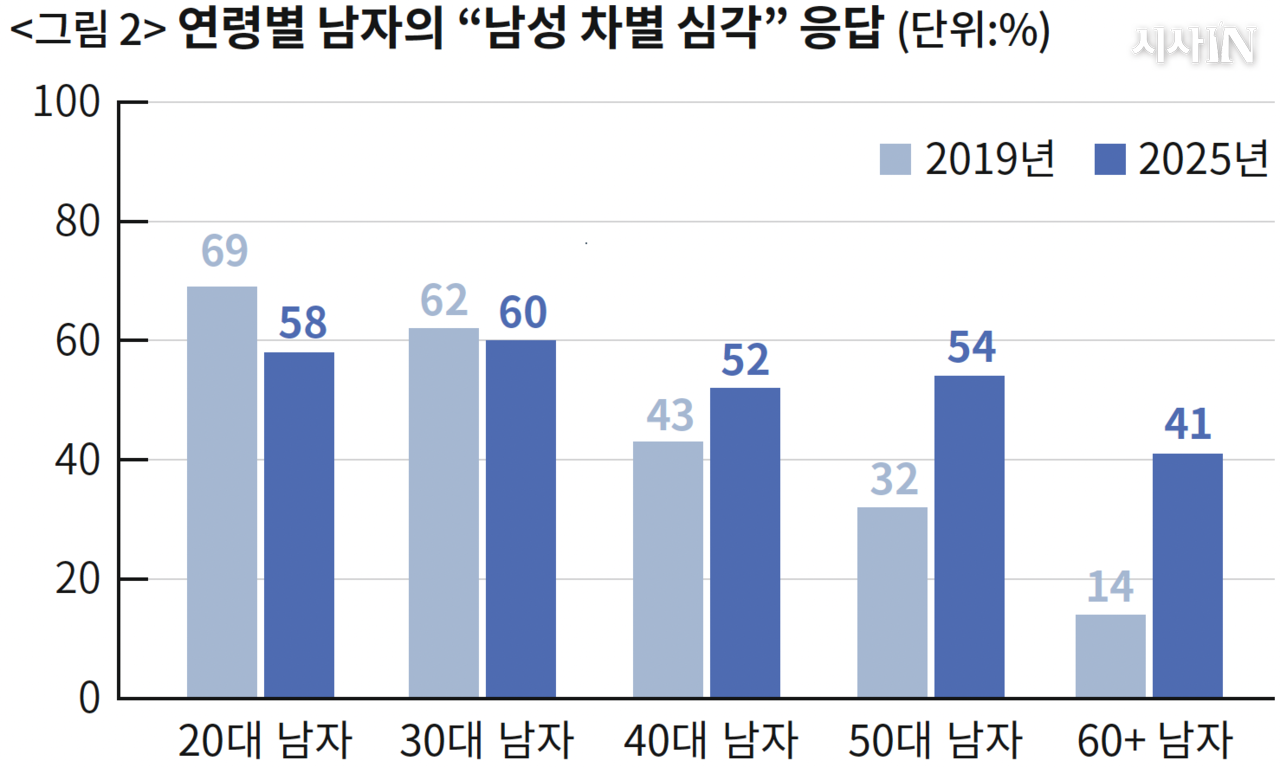 2019년의 청년 남성은 나이가 들어도 남성 차별 의식이 옅어지지 않았고, 기성세대 남자들은 청년 남자들에게 그때보다 지금 ‘남성 차별 심각’에 더 많이 동의한다.