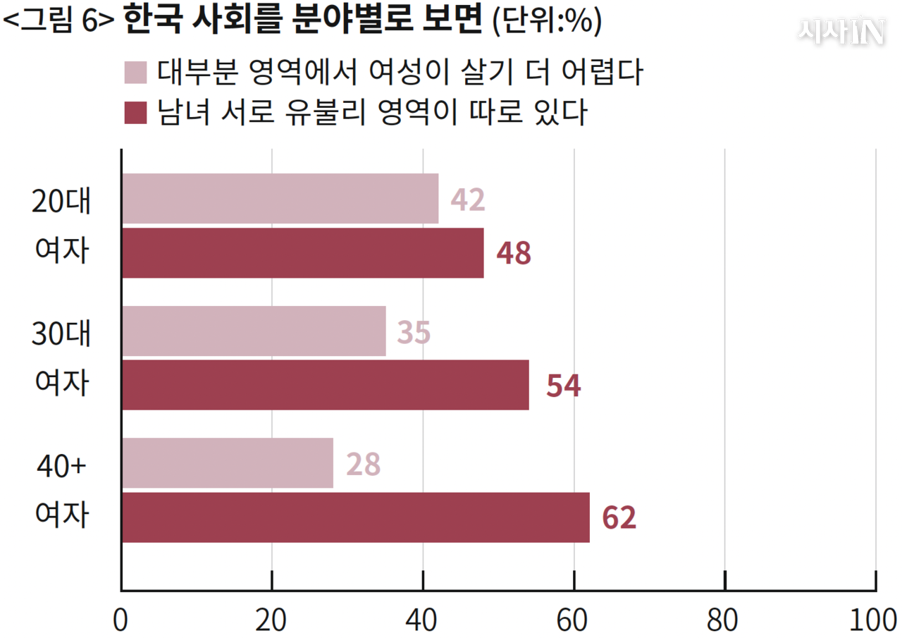 여기서 예상되는 반론 하나를 검토해보자. 한국이 구조적 여성 차별 사회라면, 즉 첫 번째 답변(‘여성이 대부분 영역에서 더 살기 어렵다’)이 정답이라고 한다면, 남자들 대부분이 고른 세 번째 답변은 그저 ‘좀 덜 나쁜 오답’이라고 주장할 수 있다. 이 주장이 옳아서 최소한 여성들에게는 공감을 얻었다면, 같은 질문에 대한 여자들의 답은 첫 답변으로 기울어야 할 것이다. 결과는 그렇지 않다. 〈그림 6〉이다. 모든 세대 여자들에게서, “남녀 서로 유불리 영역이 따로 있다” 응답이 “대부분 영역에서 여성이 살기 더 어렵다” 응답보다 높다. 청년 여성으로 갈수록 두 응답의 격차는 줄어든다. 하지만 20대 여성까지 내려가도 역전이 일어나지는 않는다.