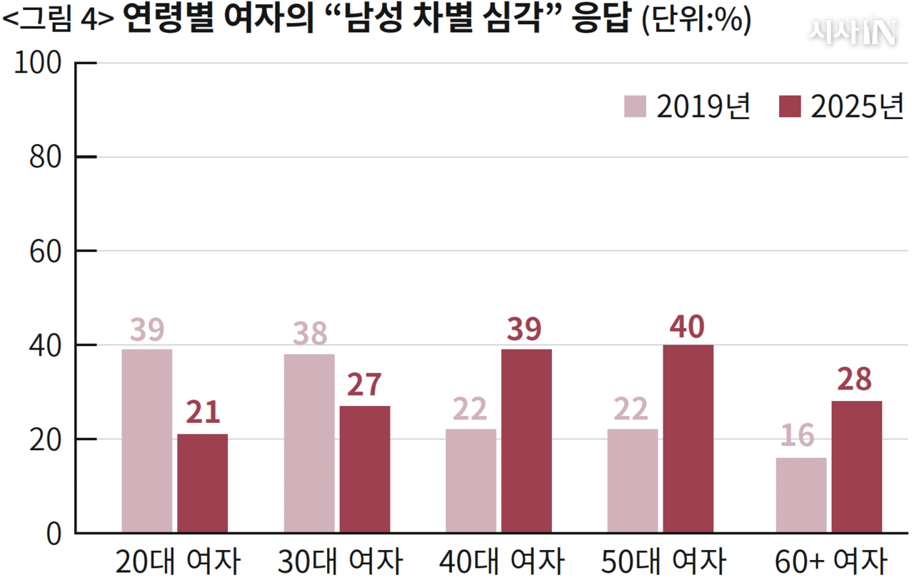 2030 여성과 40세 이상 기성세대 여성이 반대 방향으로 움직였다. 2030 여성은 2019년에도 “남성 차별”에 시큰둥했지만, 7년 동안 더 시큰둥해졌다. 반면 40세 이상 기성세대 여성은 “남성 차별” 공감이 여전히 소수이지만 커지는 중이다.