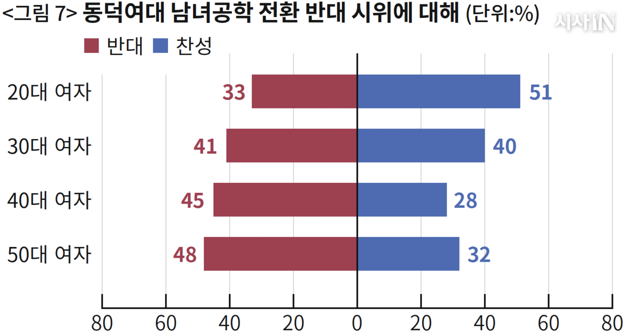 2024~2025년 동덕여대에서는 학교 측의 남녀공학 전환 방침에 반대하는 재학생들의 시위가 격렬하게 이어졌다. 이 시위에 대해 40세 이상 여성들은 반대 의견이 더 많았다(〈그림 7〉). 즉, 기성세대 여성은 동덕여대 시위자들에게 덜 공감했다. 30대 여성은 찬반이 팽팽했고, 20대 여성만 찬성이 높았다.