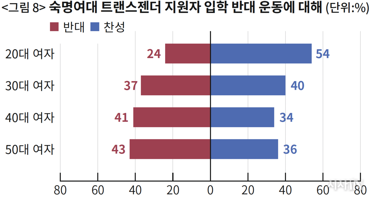 2020년에는 숙명여대 재학생 일부가 트랜스젠더 합격자의 입학을 반대하는 시위를 벌여, 결국 합격자가 입학을 포기하는 사건이 있었다. 이에 대해서도 40세 이상 기성세대 여성은 반대가 많았고, 30대 여성은 팽팽했으며, 20대 여성만 찬성이 확실히 높았다(〈그림 8〉). 동덕여대 문제와 패턴이 같다. 남성들은 두 시위 모두 반대가 높다. 즉, 두 시위는 청년 여성들을 제외하고 모든 세대 성별에서 지지받지 못한다.