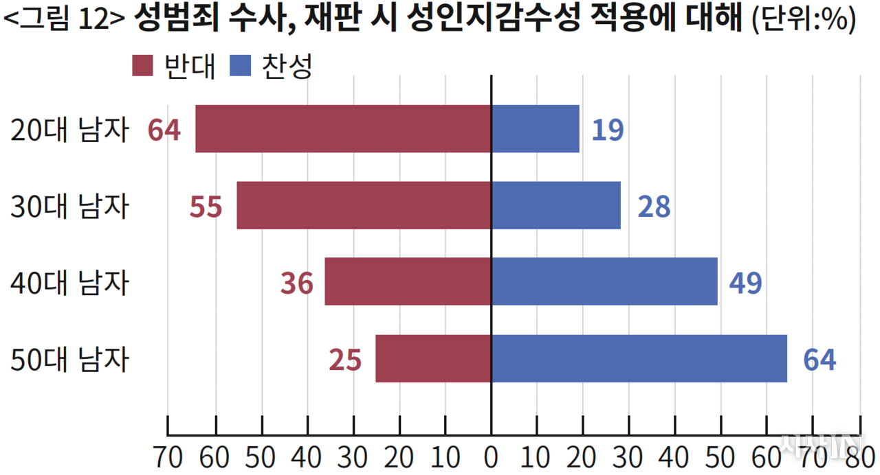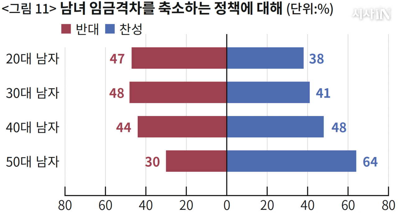 강한 정체성 이슈에는 여성 내부의 세대 차이가 드러난다. 반면 보편적 정당화 명분이 강한 이슈(임금격차 축소, 성범죄 처벌)에서는 합의가 강력하다. 그렇다면 여성 내부 합의가 강력한 이슈에 대해 남자들의 태도는 어떨까?