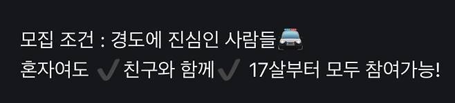 "동네마다 다르고, 경찰 도둑 구분하는 것도 모임마다 달라. 나이도 17세 이상도 있었고, 미성년자는 안된다는 방도 있었고, 만나는 시간대도 모집하는 방마다 달라. 약간 번개모임 같은 거라서 정해진 게 없어. 근데 우리가 한 경도는 17세 이상. 8시 이후 동네 공원이었어."