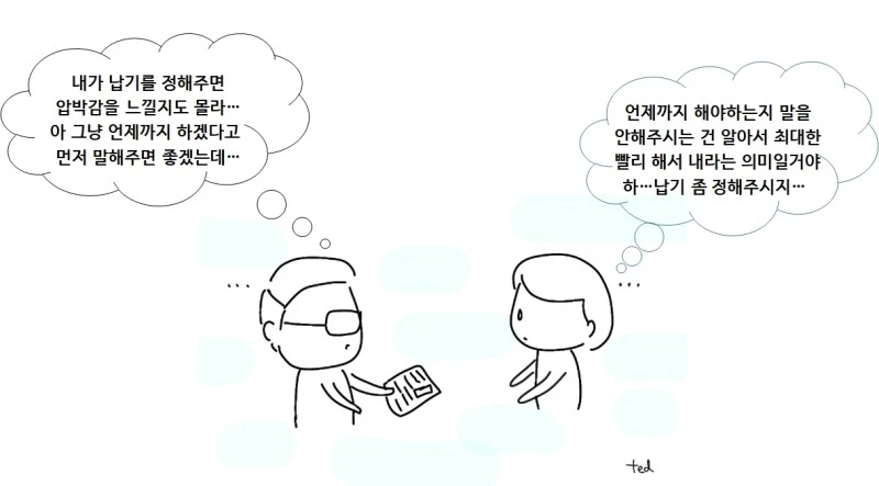 사원: 네. 그리고 일을 시키면서 언제까지 해야하는지 말을 안해줘요. 납기 날짜를 알려주지 않으니 최대한 빨리 해서 제출할 수 밖에요. 그러다 보니 예상치 못하게 야근을 해야하는 날들이 많아서 개인 일정을 잡을 수 없어요. 적어도 언제까지 해야하는지는 알려줘야 하는 것 아닌가요?