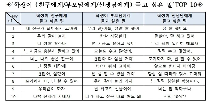 세상에… 그리고 저는 학생이 부모님에게 듣고 싶은 말과 학생이 선생님에게 듣고 싶은 말을 다시 한 번 봤습니다. 그리고 윗순위에 있는 문장들 몇 개를 진짜 말 하는 것처럼 해 봤습니다. 소근소근 입모양으로요. 윗순위만 한 이유가 사실 있습니다. 제기랄! 몇 문장을 해 봤더니 그것도 소근소근 입모양으로만 했는데도 너무 심하게 마음이 미어져서 더 이상 할 수 없었습니다!!!