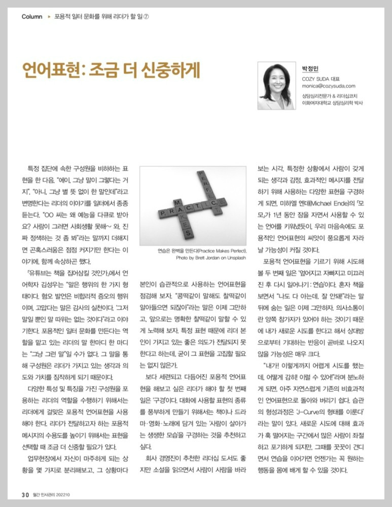 다양한 특징을 가진 구성원들을 포용하는 리더의 역할을 수행하려면, 리더에게 걸맞는 포용적 언어표현을 사용해야 한다. 리더가 전달하고자 하는 포용적 메시지의 수용도를 높이기 위해서는 표현을 선택할 때 조금 더 신중할 필요가 있다. 업무현장에서 자신이 마주하게 되는 상황을 몇 가지로 분리해보고, 그 상황마다 본인이 습관적으로 쓰는 언어표현들을 점검해 보자.
