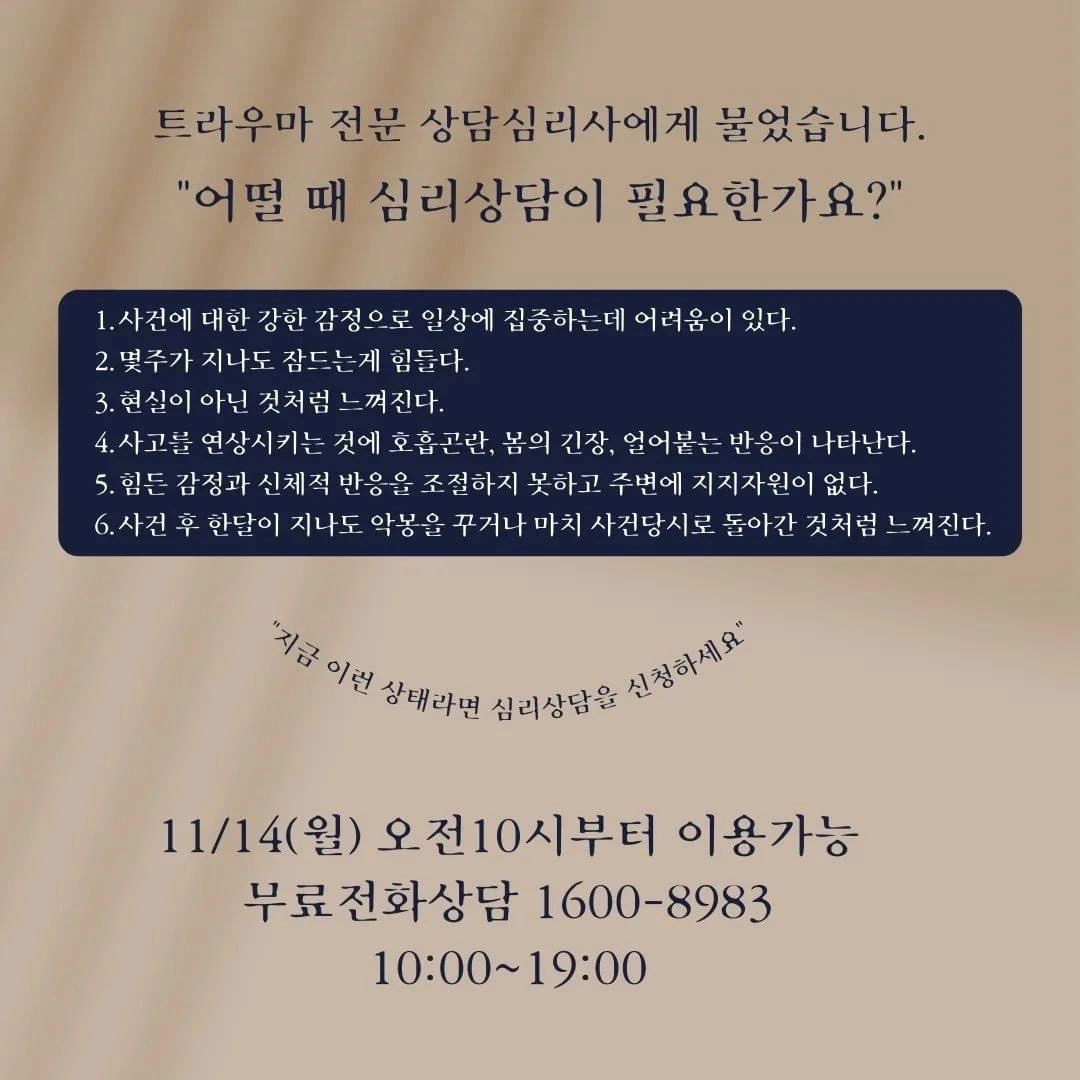 (사)한국상담심리학회 이태원참사 심리상담서비스(무료, 전화상담, 11/14(월) 오전10시 시작 )