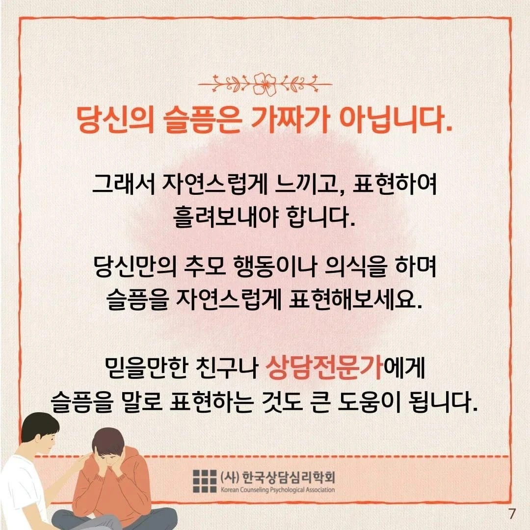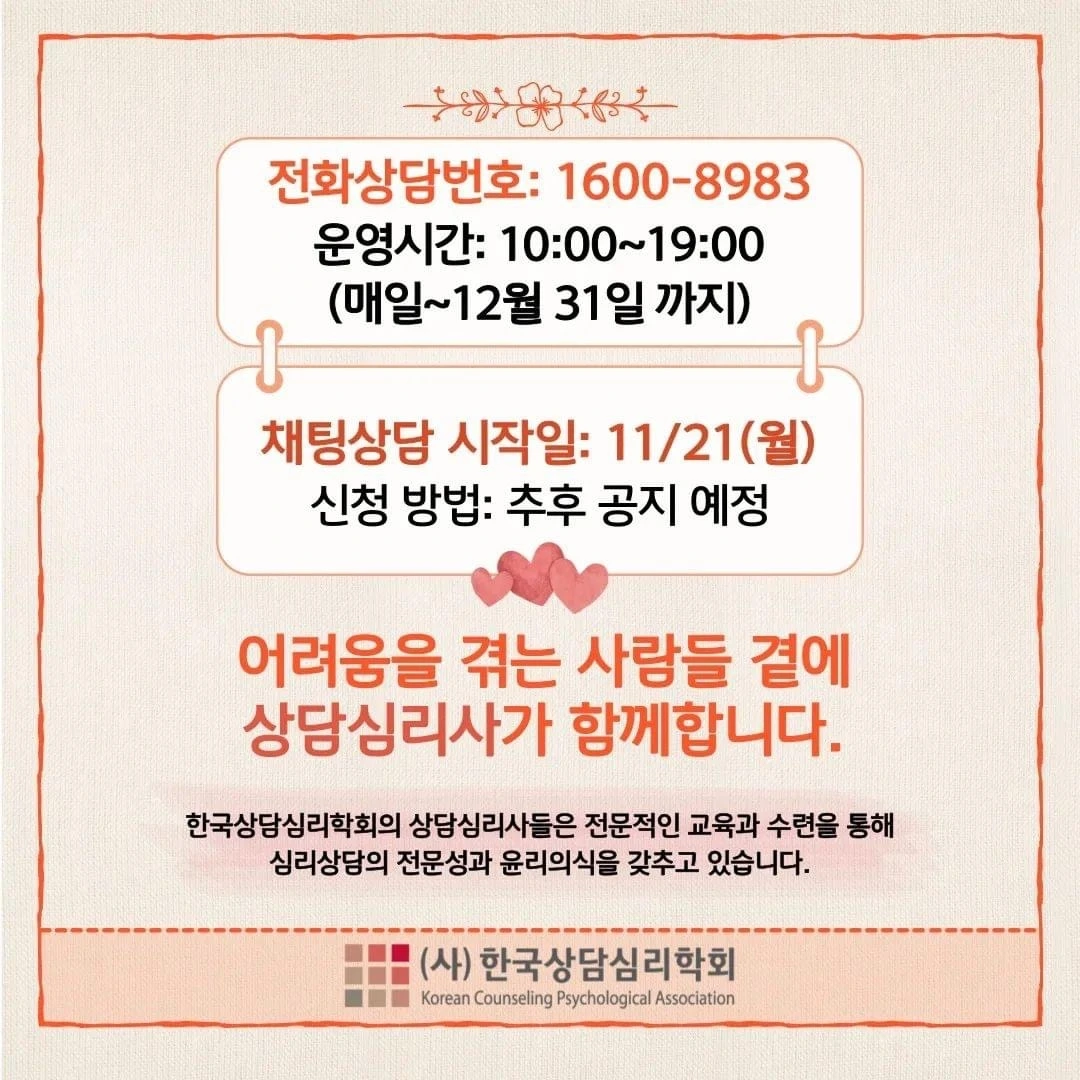 당신의 슬픔을 믿을만한 친구나 상담전문가에게 표현해보세요. (사)한국상담심리학회는 상담전문가로서의 역할을 다하기 위하여 무료로 전화심리상담을 제공하는 채널을 개설하였습니다.