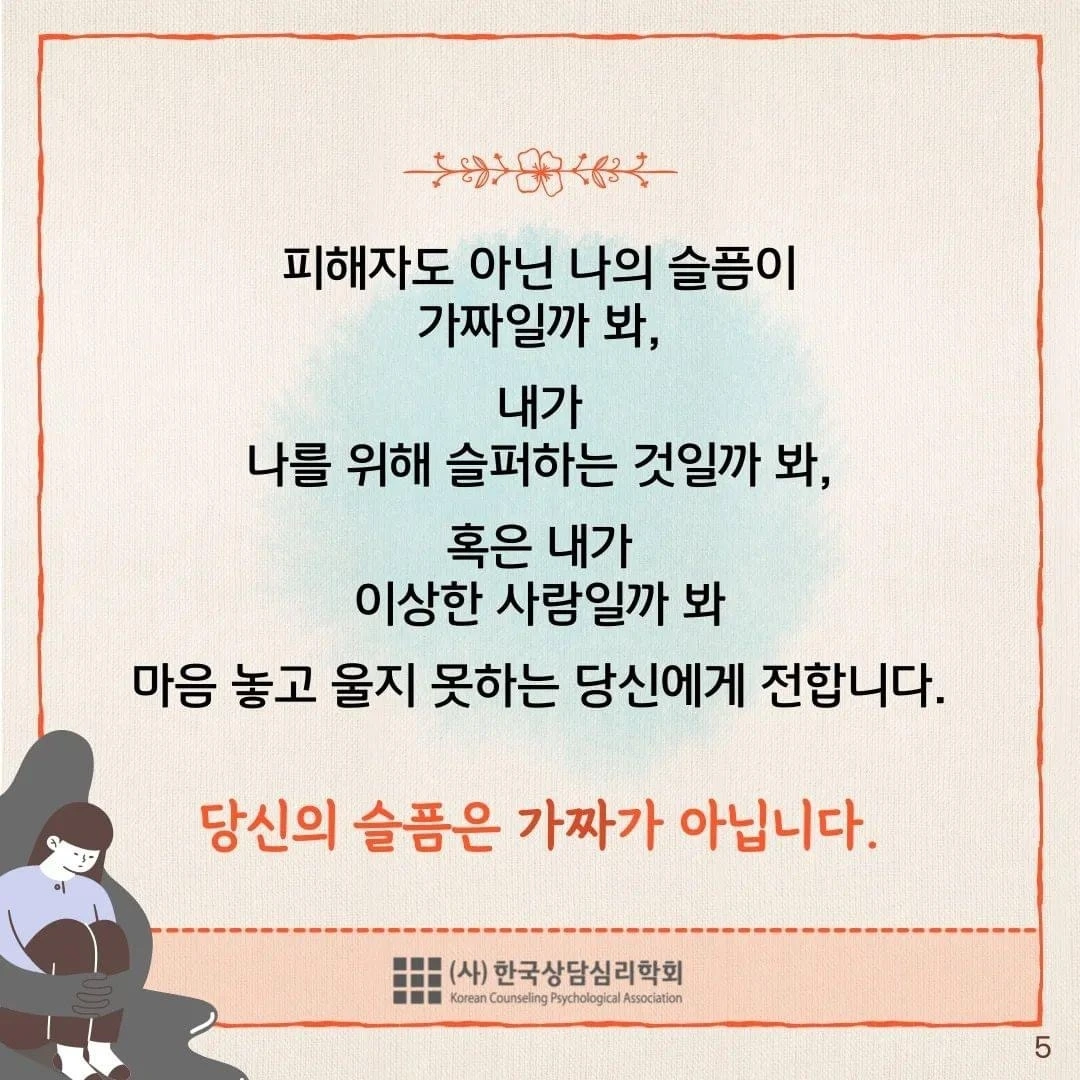 피해자도 아닌 나의 슬픔이 가짜일까 봐, 내가 나를 위해 슬퍼하는 것일까 봐, 혹은 내가 이상한 사람일까 봐 마음 놓고 울지 못하는 당신에게 전합니다.<카드뉴스 본문 중에서...>