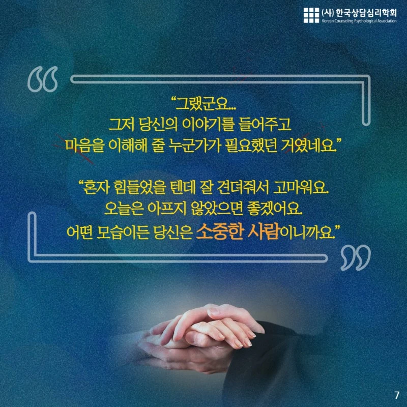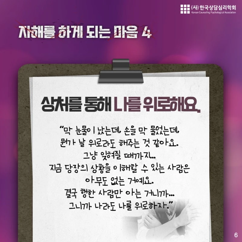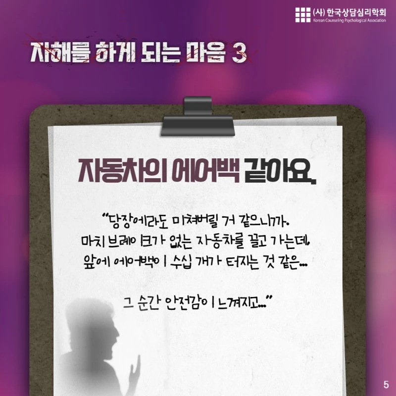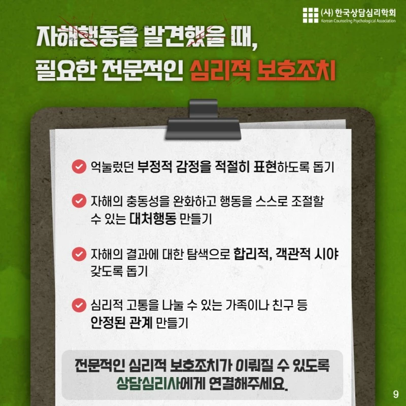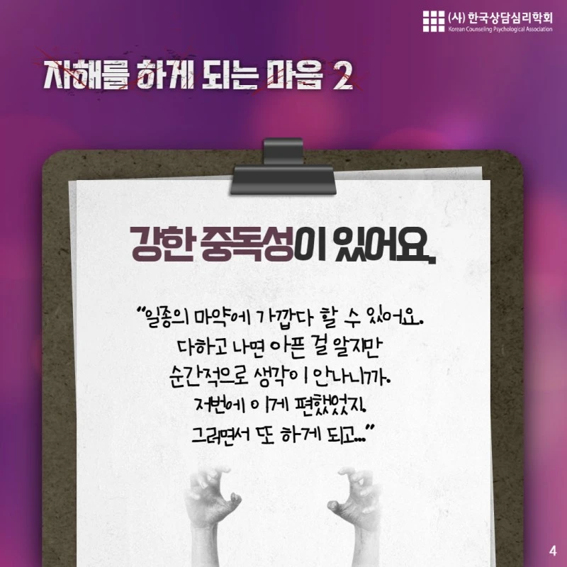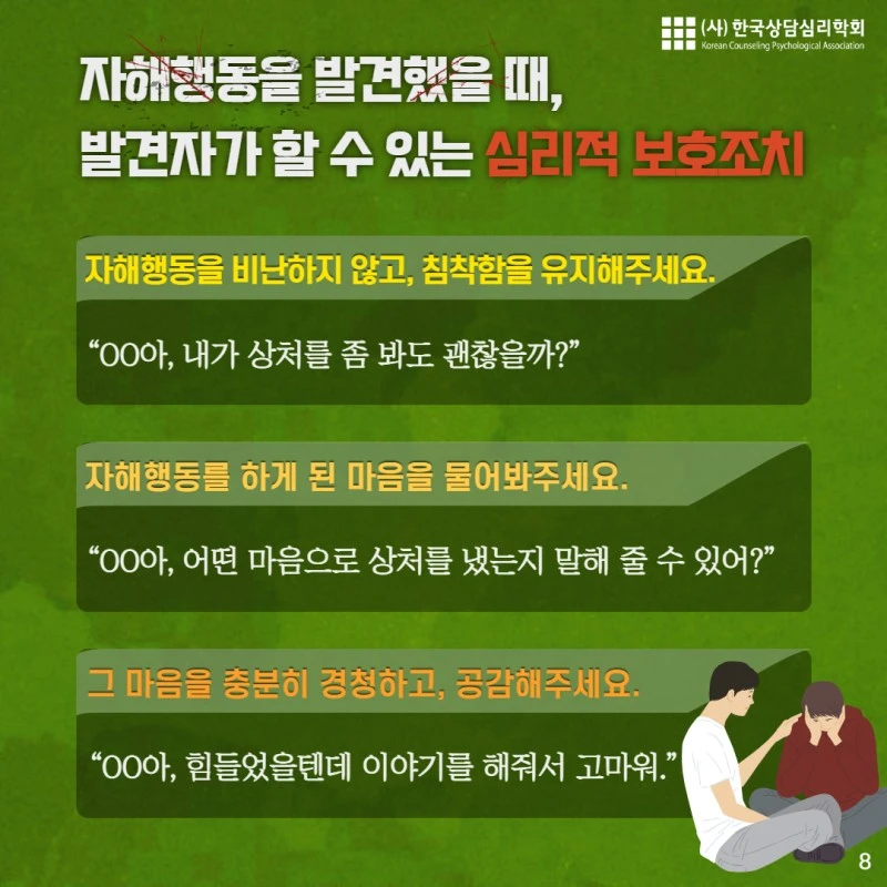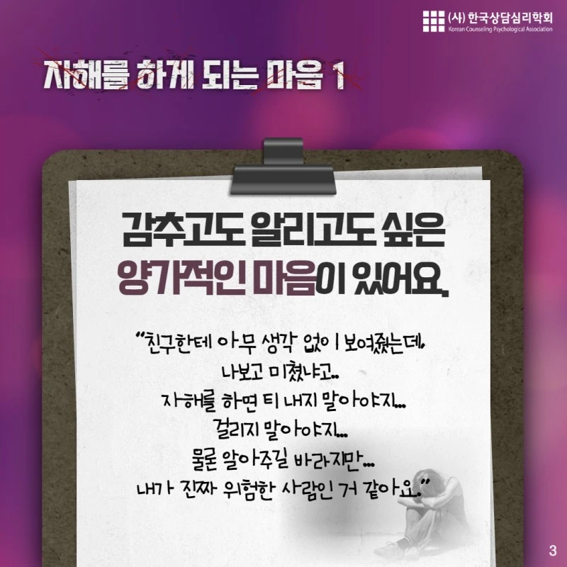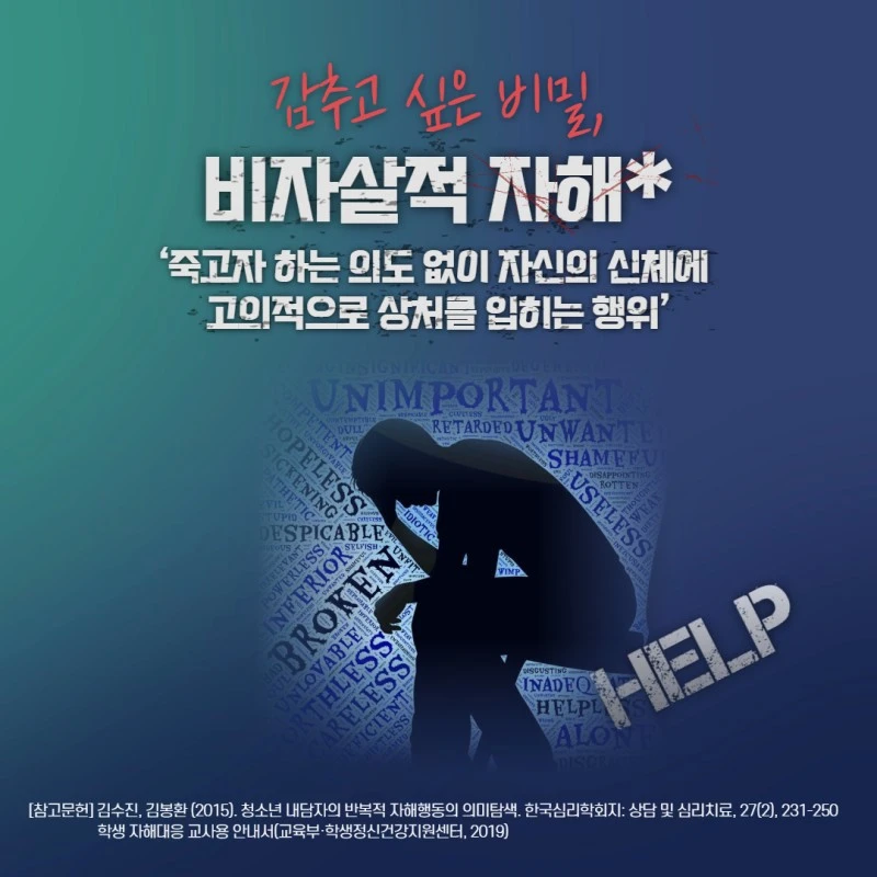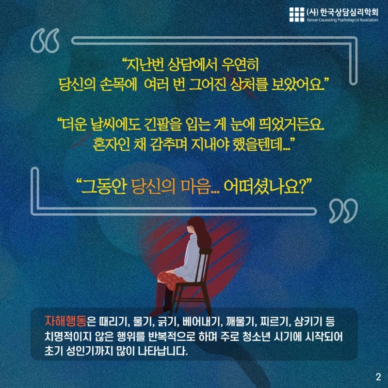 오늘 내용은 "자해"에 관한 내용입니다. 해당되시는 분이나 주변의 소중한 사람이 자해를 하고 있다는 것을 알고 걱정하시는 분에게 오늘의 카드뉴스가 도움이 되길 바랍니다.