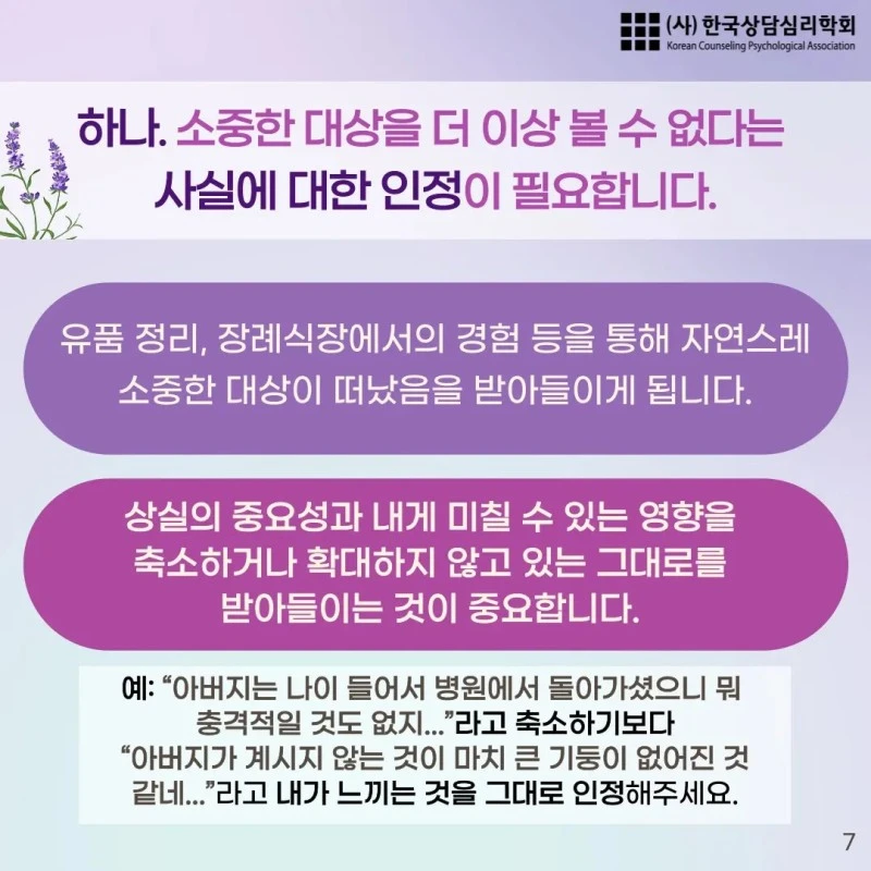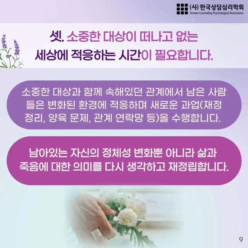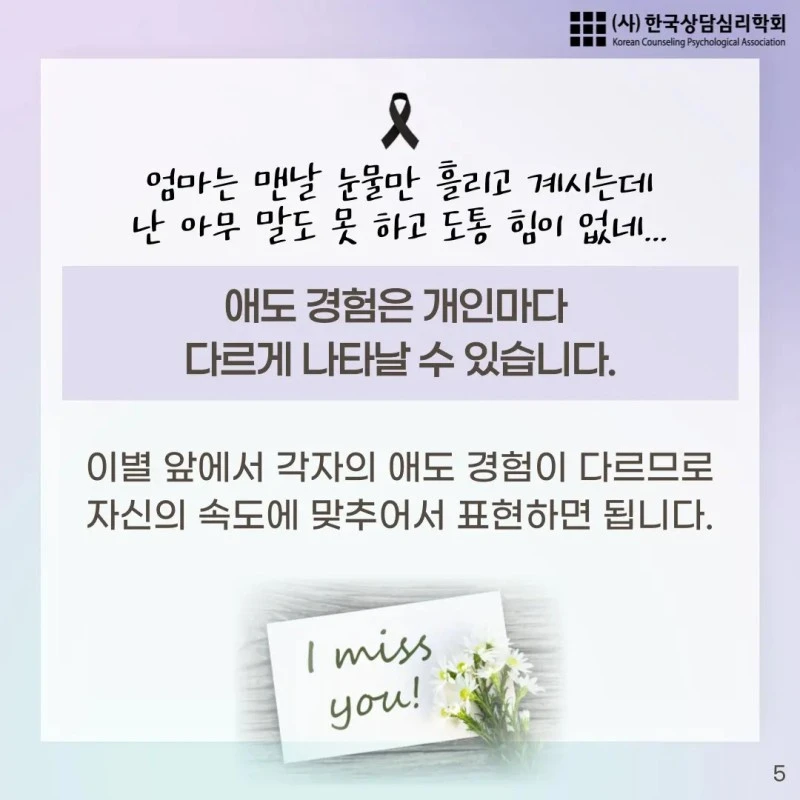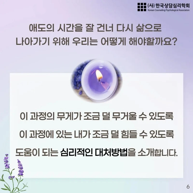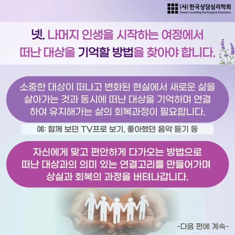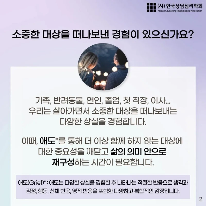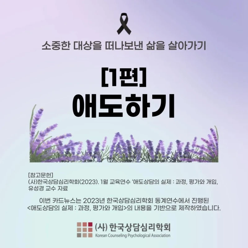 안녕하세요. 한국상담심리학회에서 제작한 '소중한 대상을 떠나보낸 후 삶을 살아가는 방법, 애도하기 1편' 카드뉴스를 공유합니다.