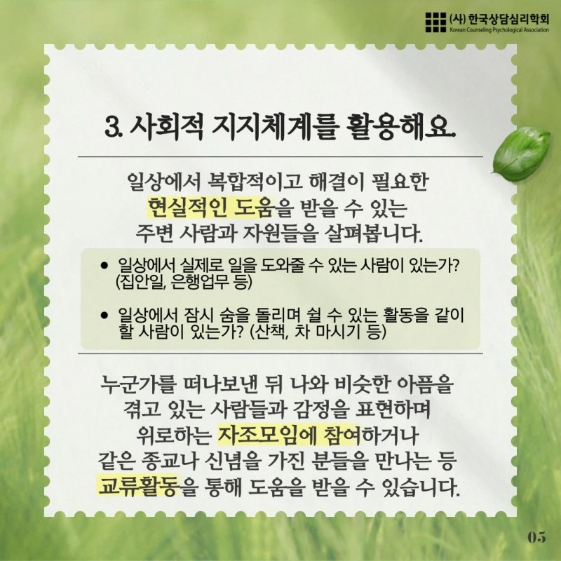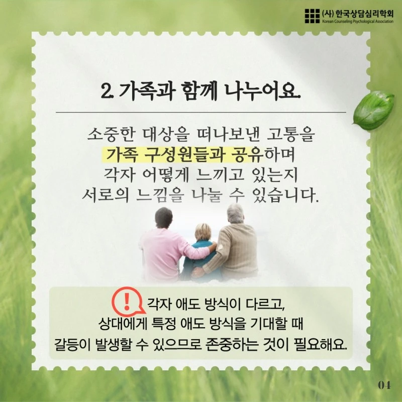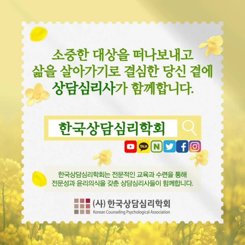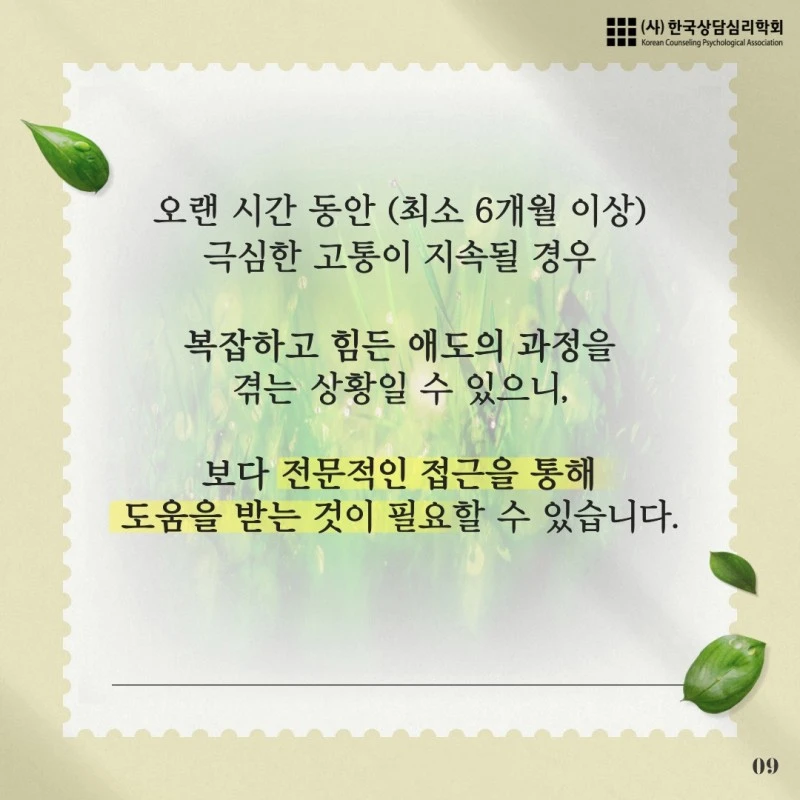 지난 번에 <소중한 대상을 떠나보낸 삶을 살아가기 1편: 애도하기> 를 함께 보았습니다. 오늘은 이어서 2편: 회복하기를 보려고 합니다. 소중한 대상과의 이별은 어떤 말을 해도, 아무리 함께 하며 위로해도 슬픔이 가시지 않는 것 같습니다. 그럼에도 우리는 애도하고 살아가게 됩니다. 사람마다 애도하는 기간이 다르고 방식이 다릅니다. 오늘의 내용이 도움이 되었으면 합니다.