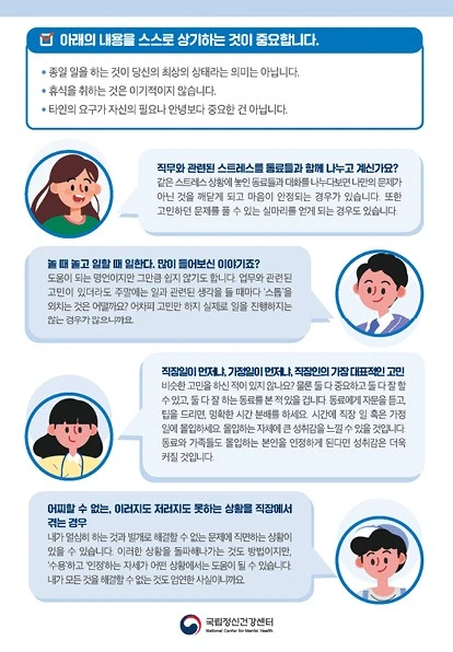 오늘은 직장인들을 위한 내용을 함께 나눠보고자 합니다. 직장인분들 상담을 하면서 많이 듣는 이야기 중 하나는 "다들 그렇지 않나요?"입니다. 어떤 경우는 다들 그렇다는 것이 위로가 되고 안심이 되기도 하지만 현재 상태에 대한 정확한 인식이 필요한 때에는 '다들 이렇게 힘든 거지 뭐...' 라는 생각이 도움이 되지 않을 때가 있습니다. 직장인분들을 응원하며, 다음의 내용을 함께 봐 봅시다.