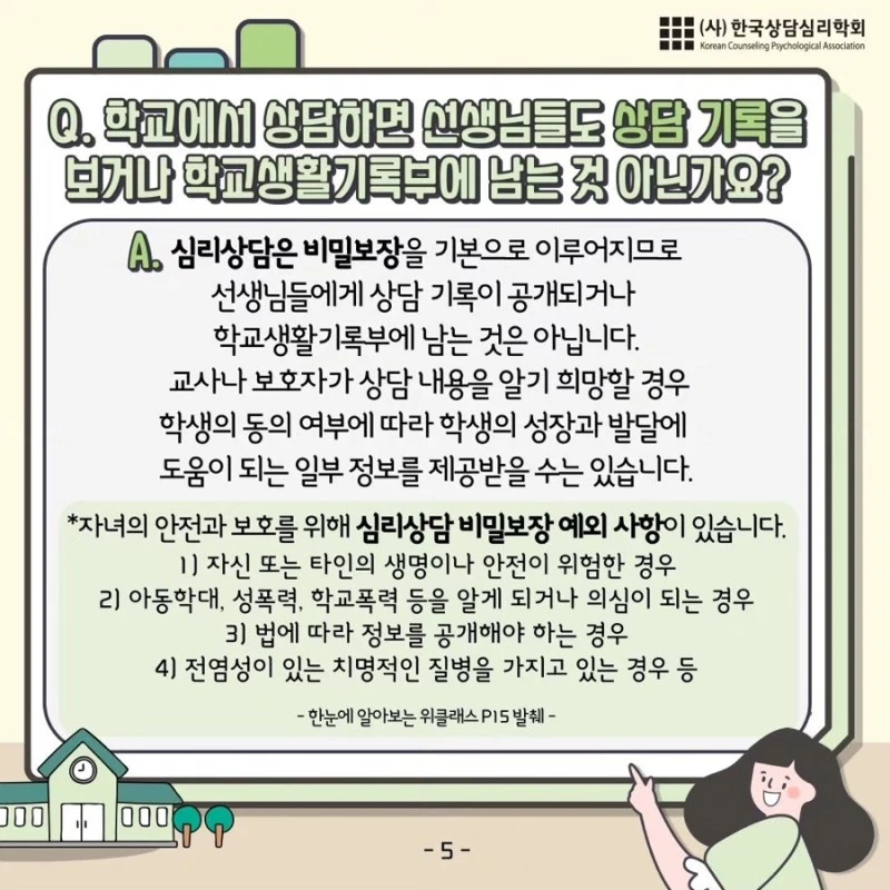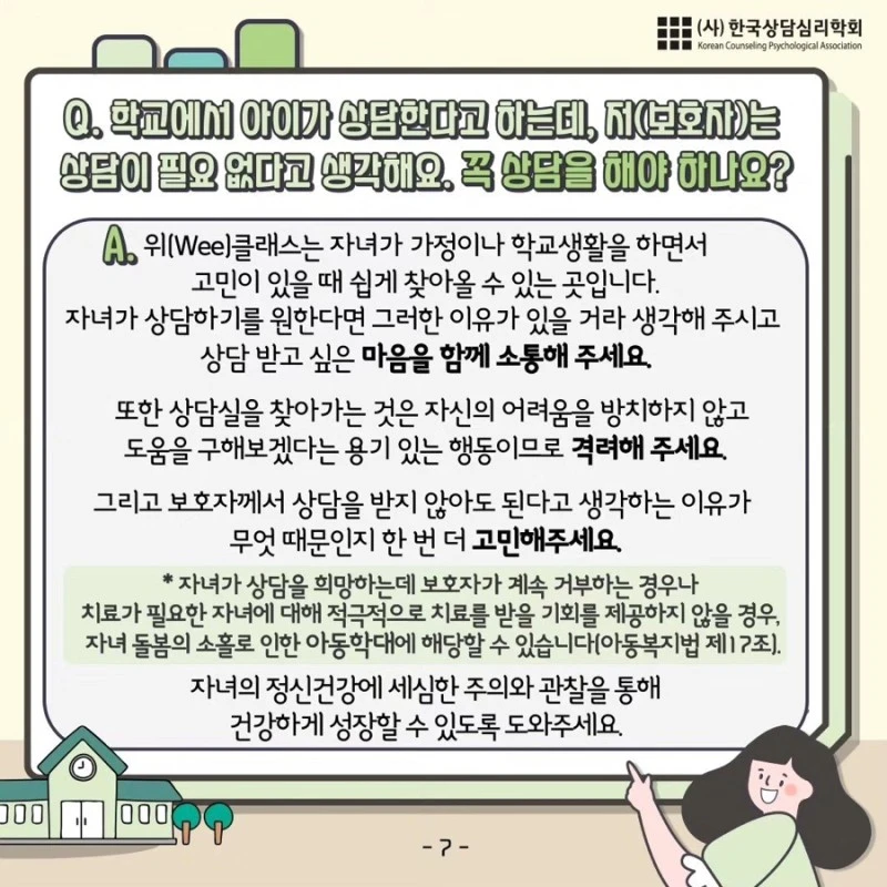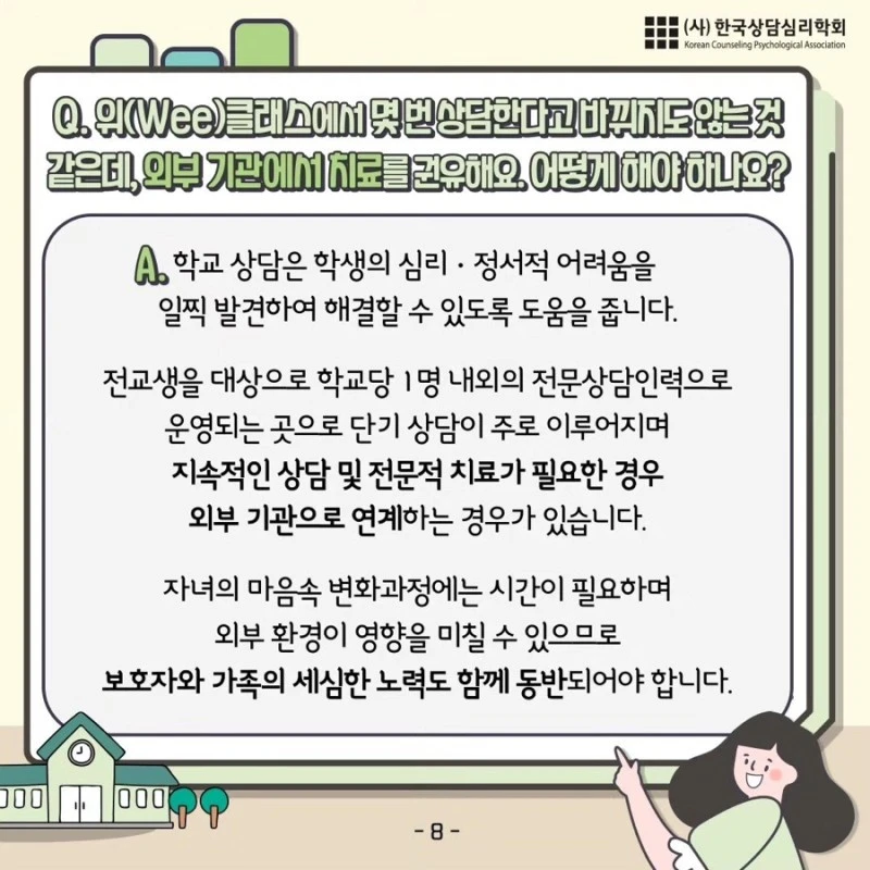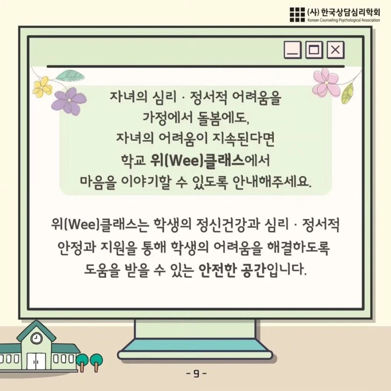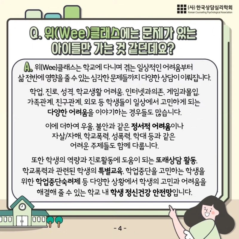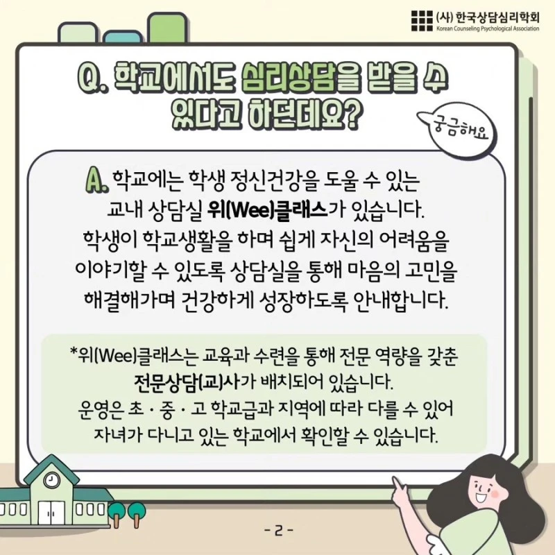 학교에는 학생의 정신건강을 도울 수 있는 교내 상담실 위(wee)클래스가 있습니다.